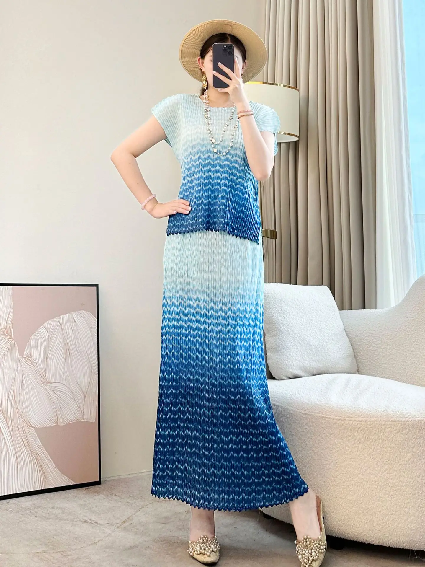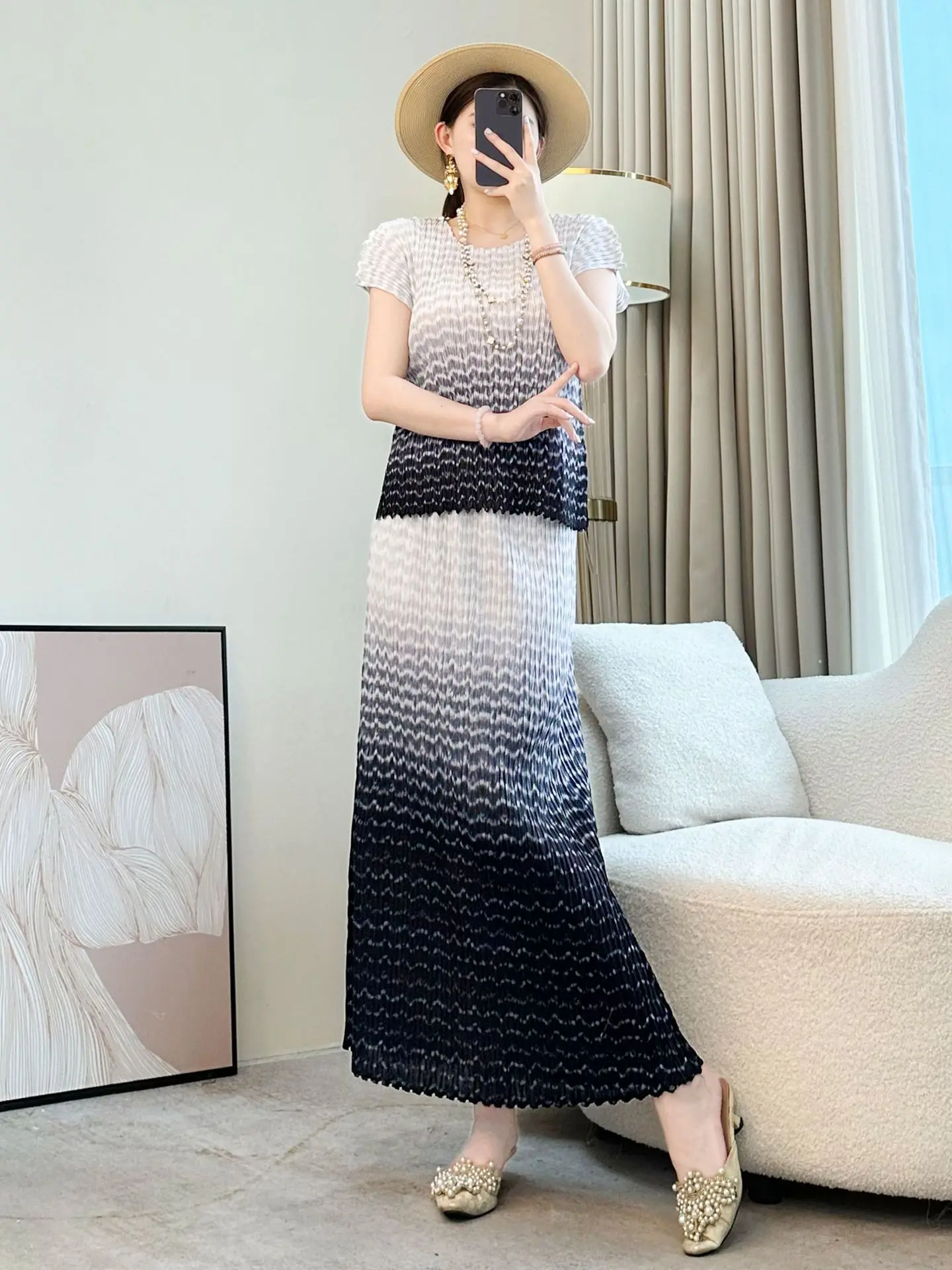 2026 New Style Women's Summer Gradient Color Miyake Pleated Dress Elegant Casual Two-Piece Set Short Tops High-End for Socialite