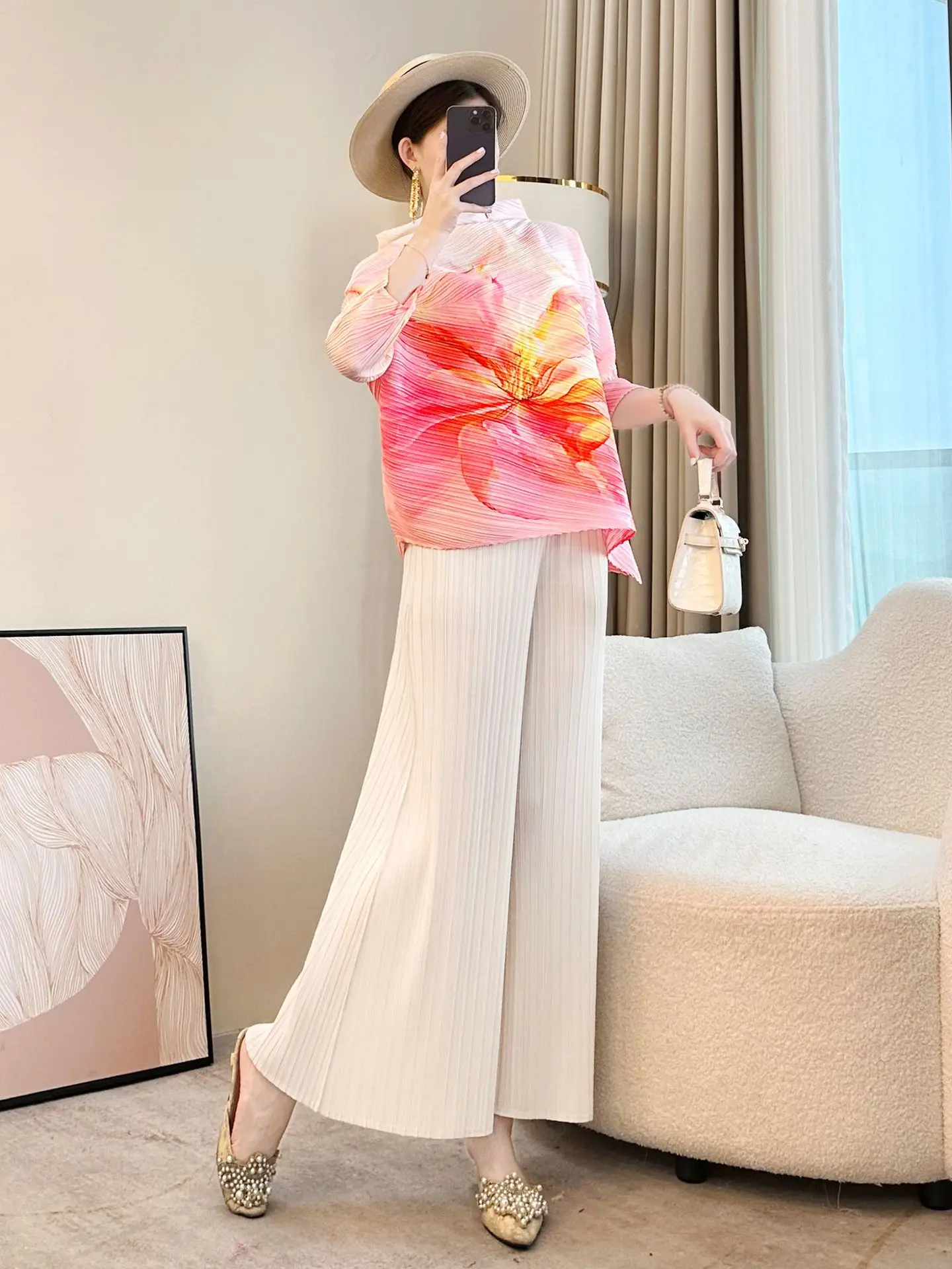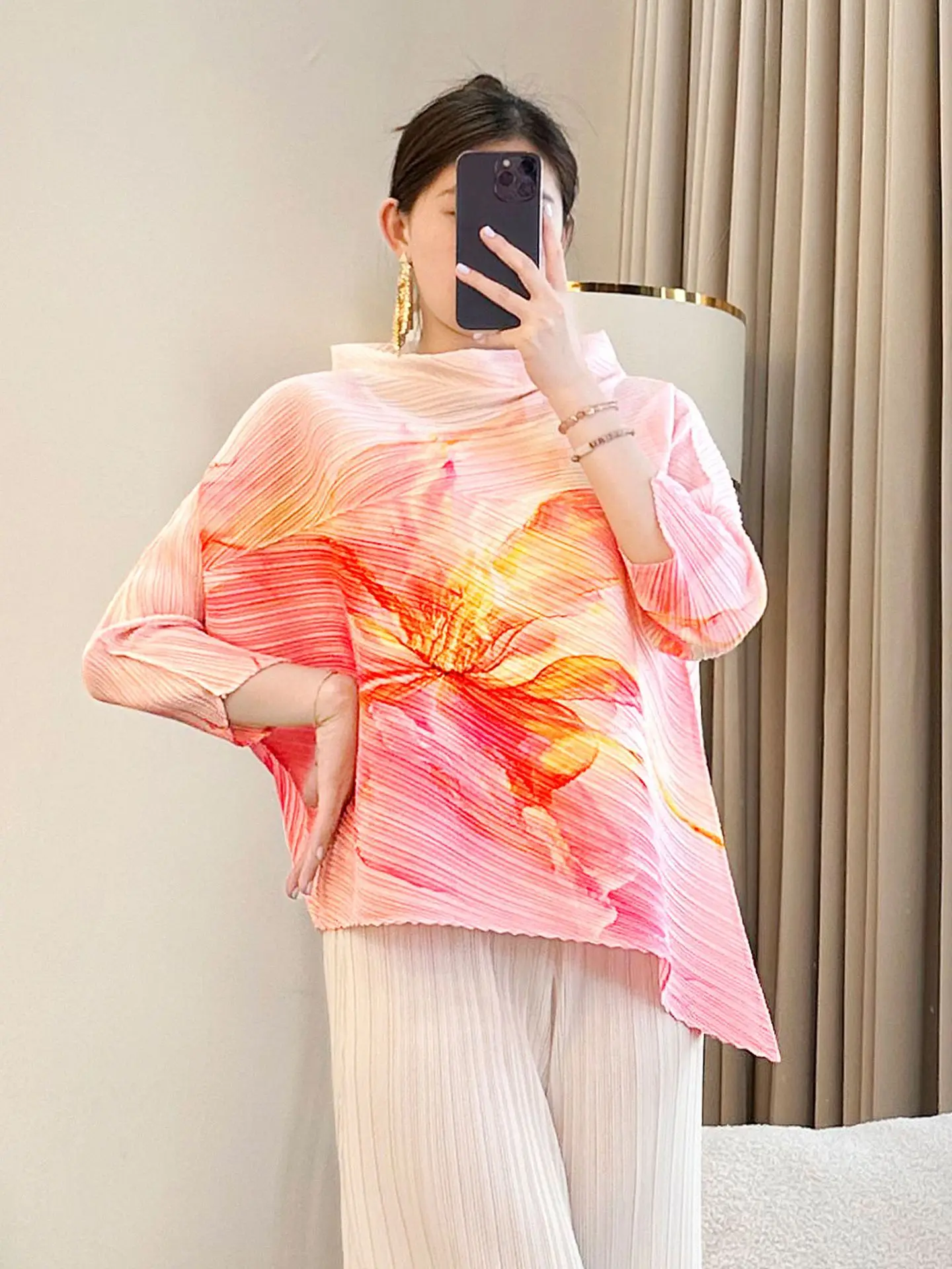 Miyake Women's Loose Lotus Top for Spring Summer New Pleated Plump Girl Large Size Belly Covering T-shirt Casual Long Design