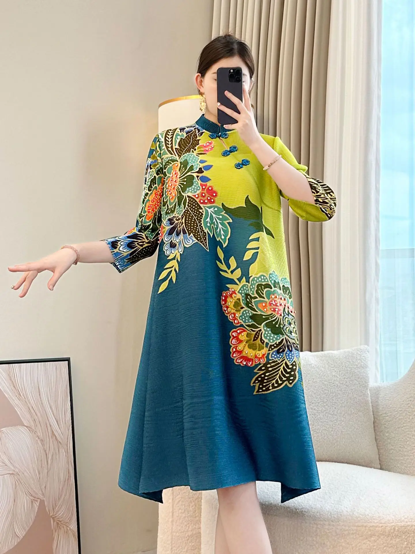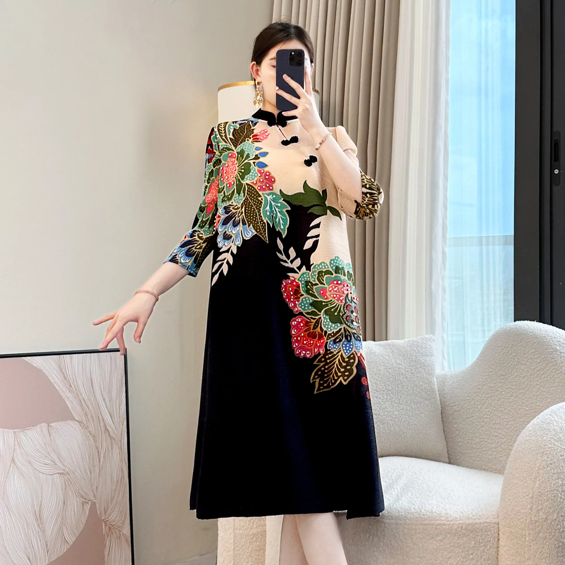 Miyake Vintage Printed Dress for Mother's Day 2026 Spring New Pleated Casual Floral Western Style with Buckle Large Size