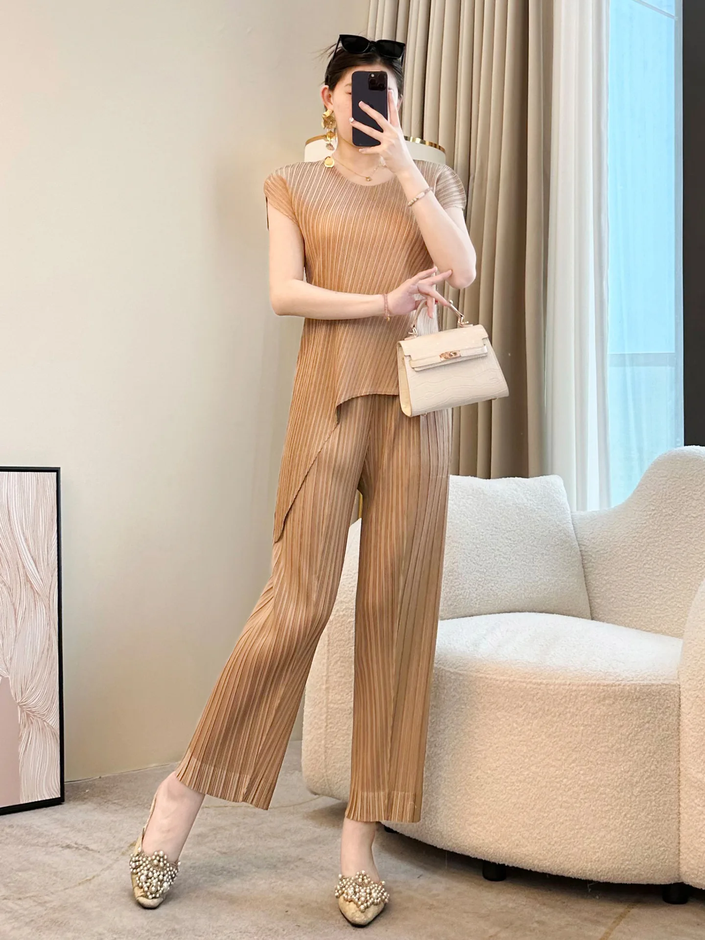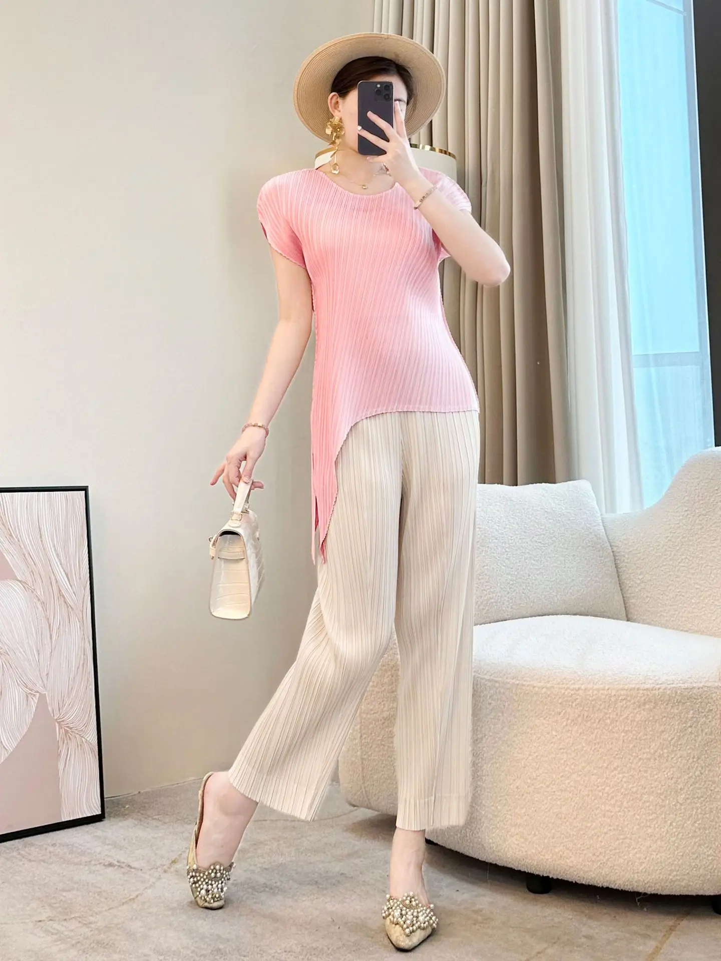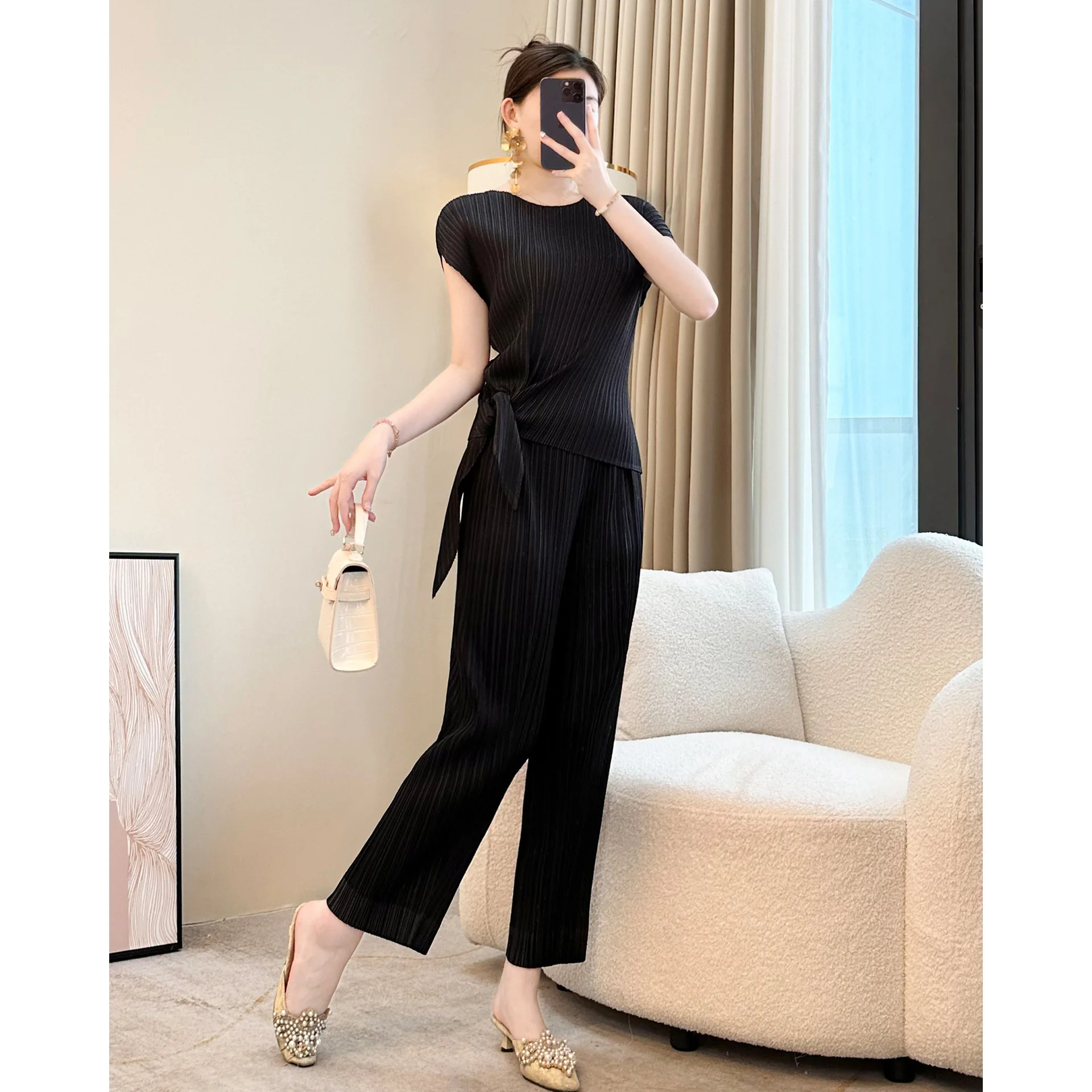 Miyake 2026 Women's Loose Fit Large Size Niche Crewneck Slim T-shirt Black Top Irregular Pleated Made Polyester Knitted