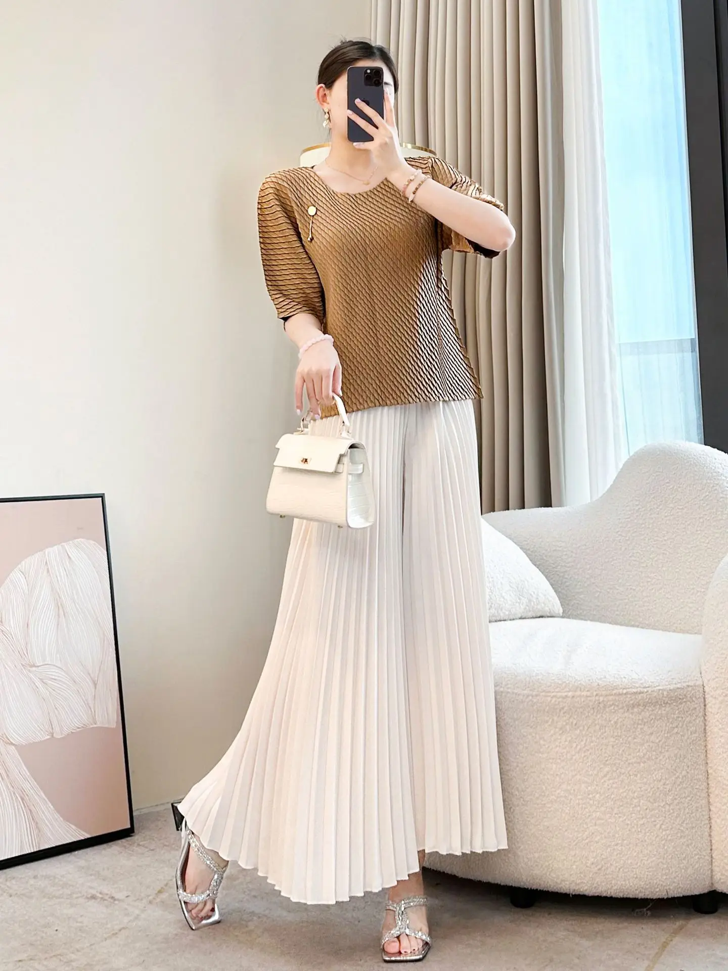 ZYHT 82053 Apricot Lace Top with Tiered Ruffled Sleeves V-Neck & Gold Buttons Blouse Wanita Elegan Women Blouse