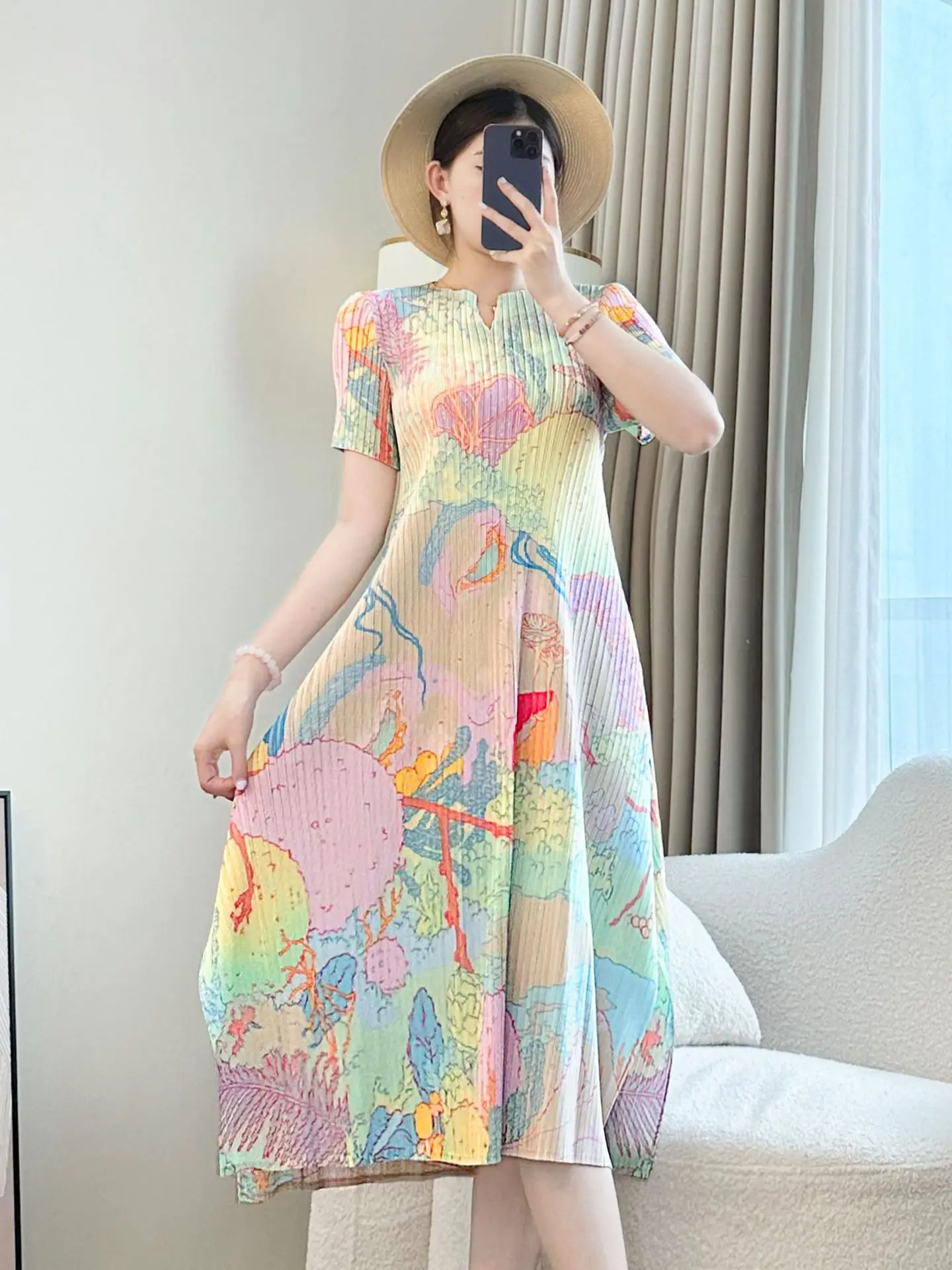 Miyake 2026 Women's Summer New Seaside Vacation Style Elegant Printed Age-Reducing Midi Dress Short-Sleeved Pleated Skirt
