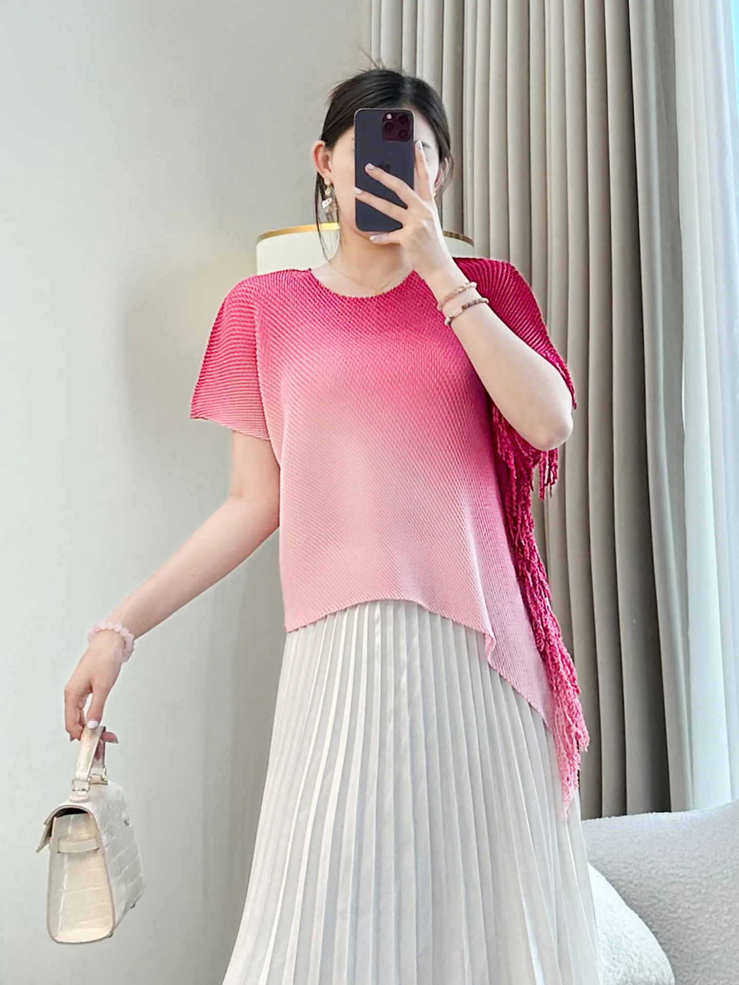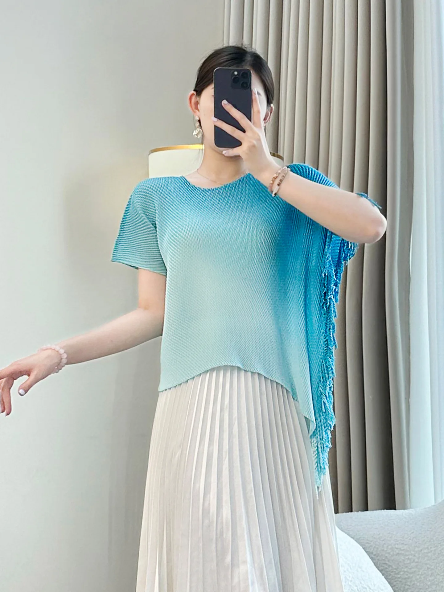 Women's Summer Chiffon Pleated Crew Neck Top Generation Hair Temperament Tassel Design Gradient Large Size T-Shirt Printed