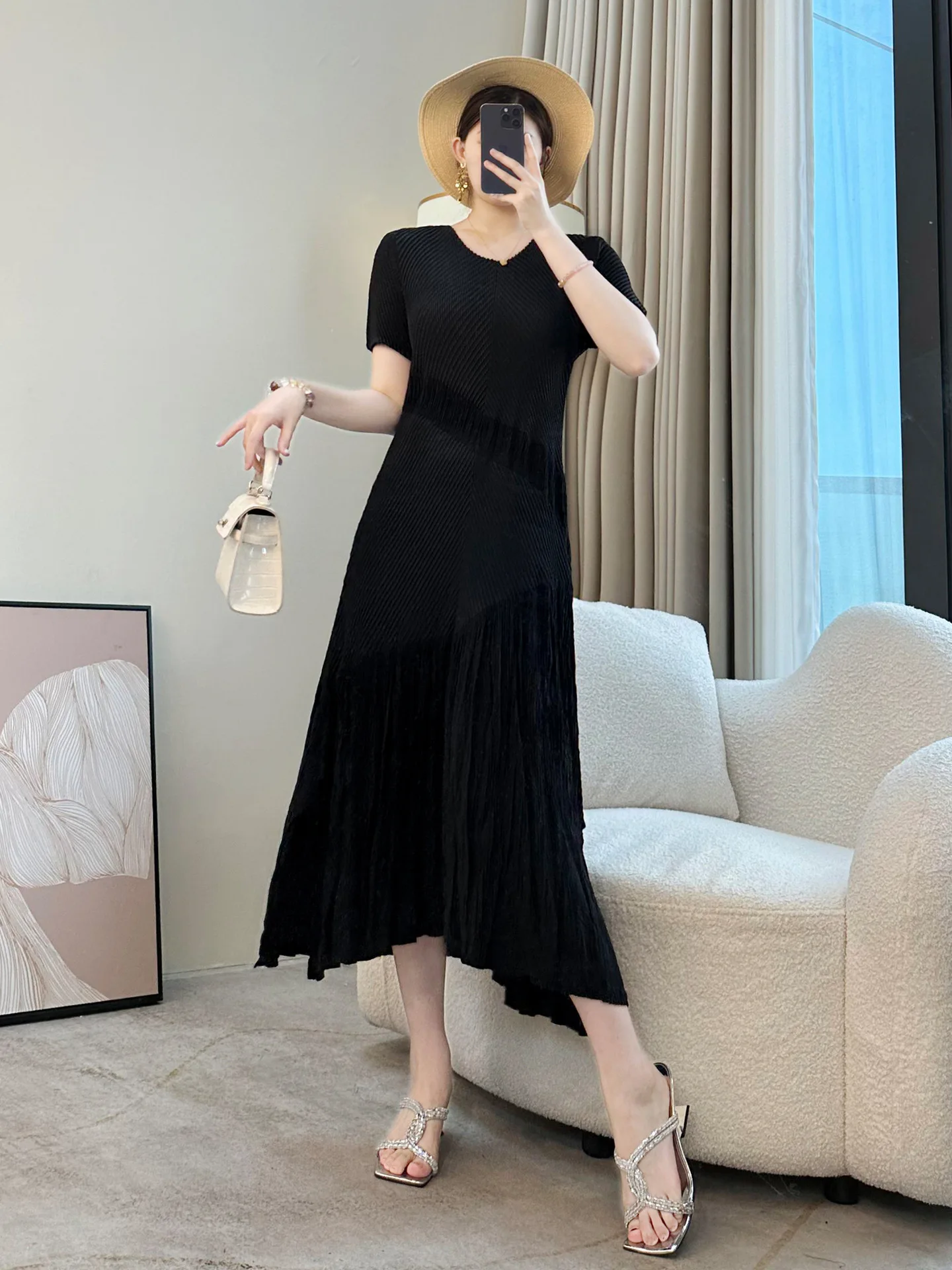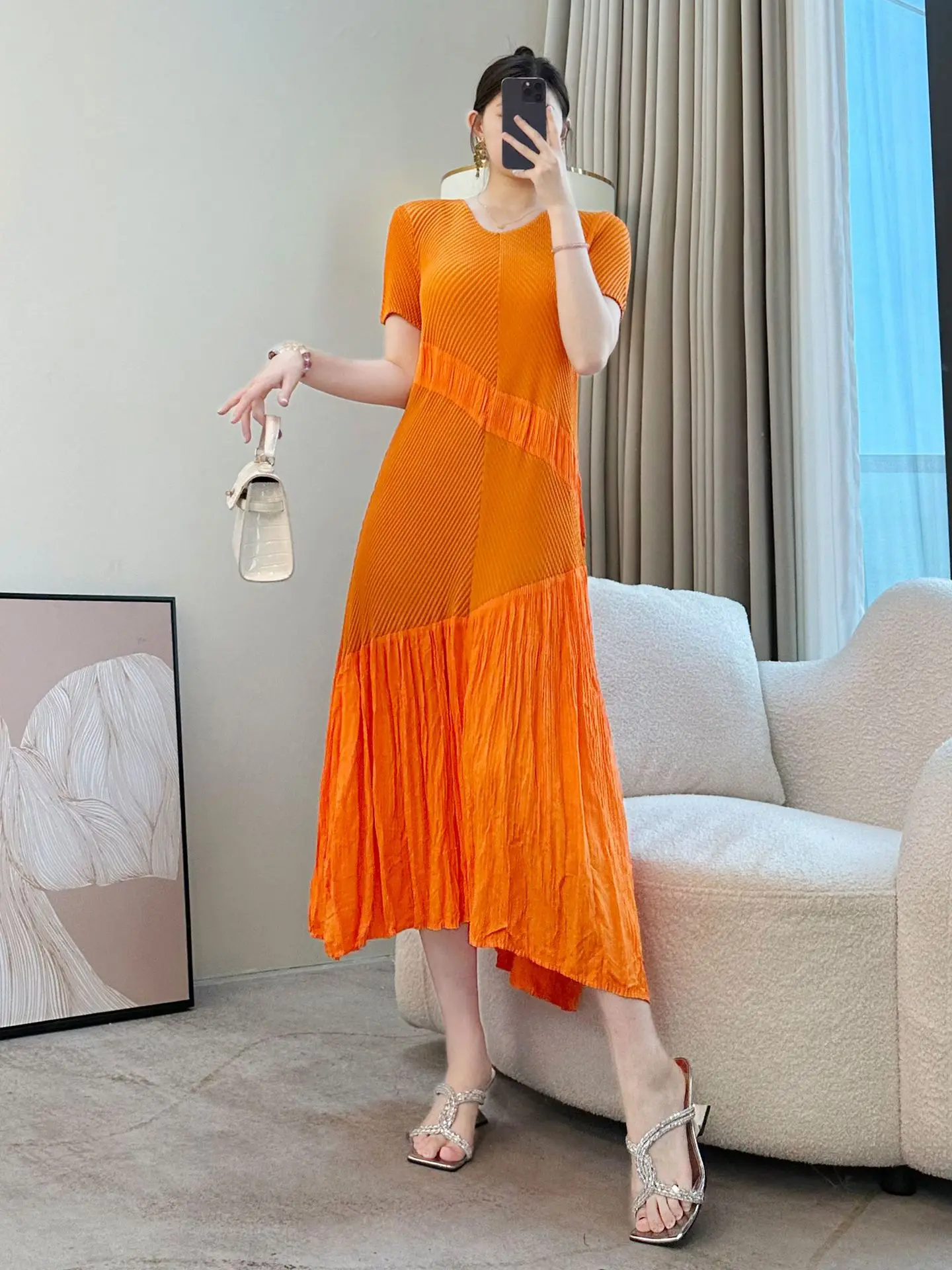 Miyake All- Match Summer Dress Rose Red Straight Pleated Dress Short Sleeves Slimming Floor-Length Western Style New Arrival