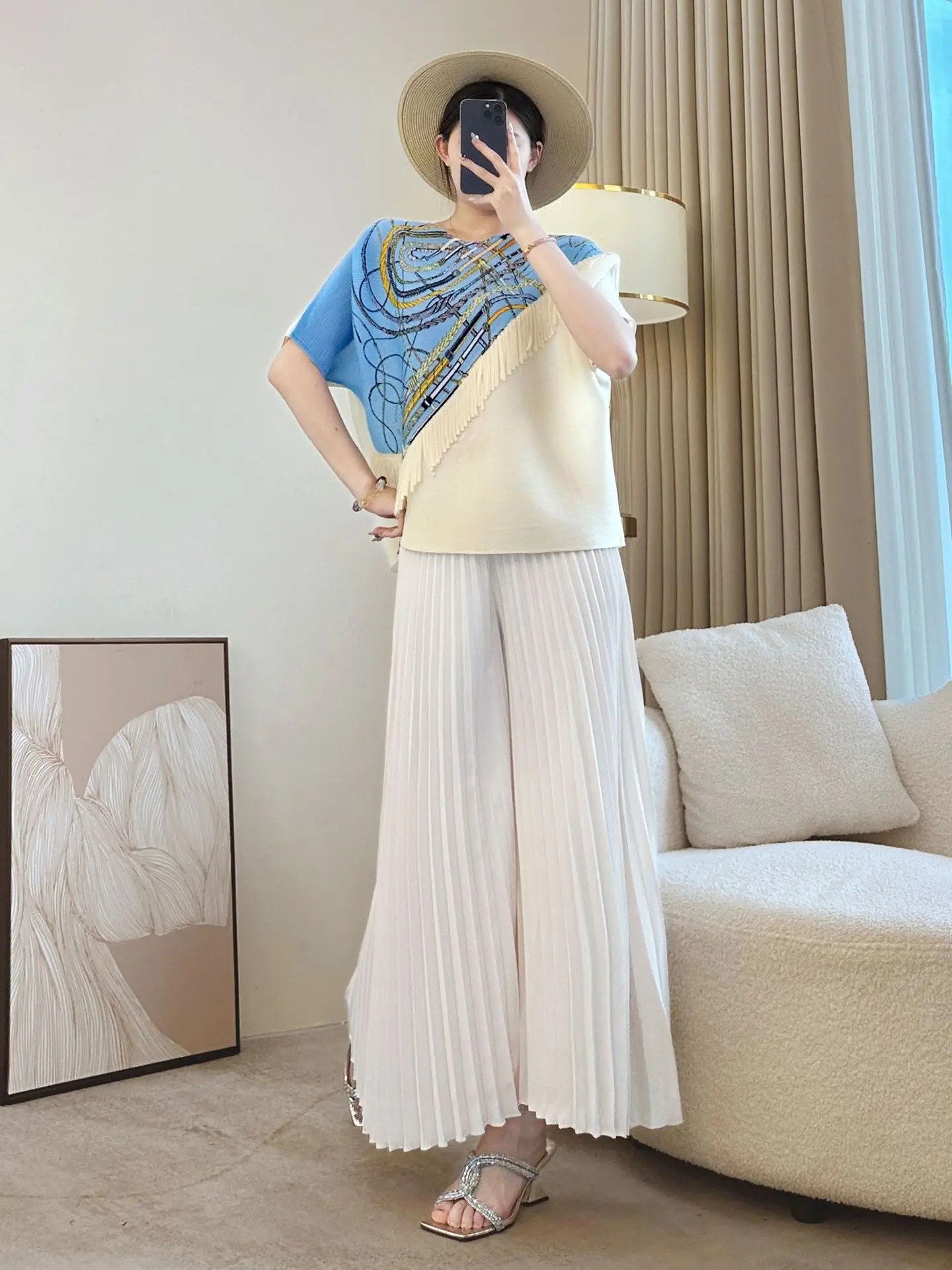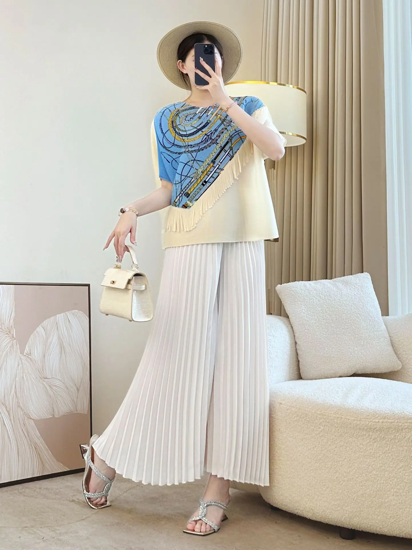 Miyake Printed Jacket Slim Fit Joker T-Shirt Summer Loose Meat Covering Foreign Style Generation Hair Polyester Chiffon