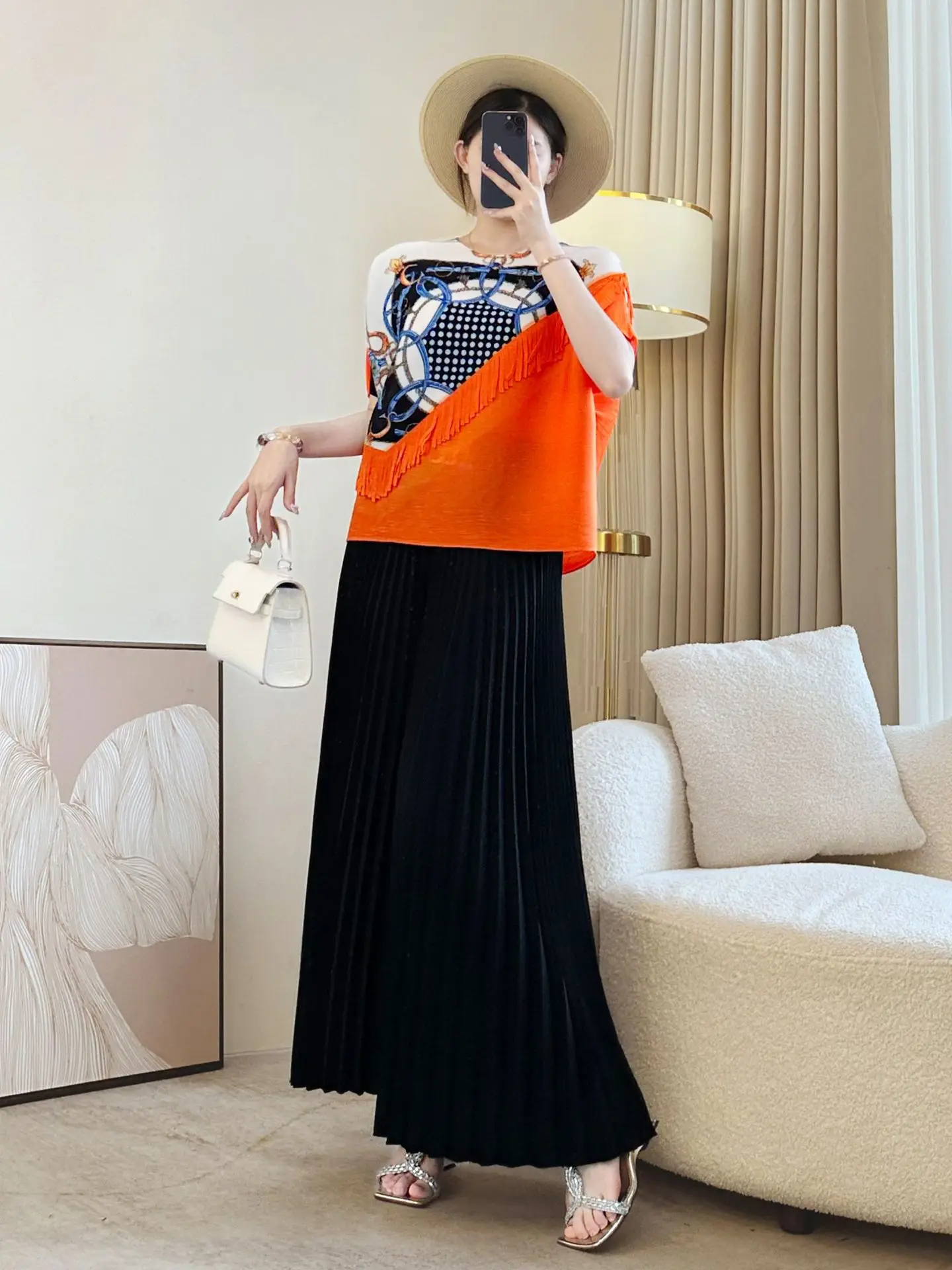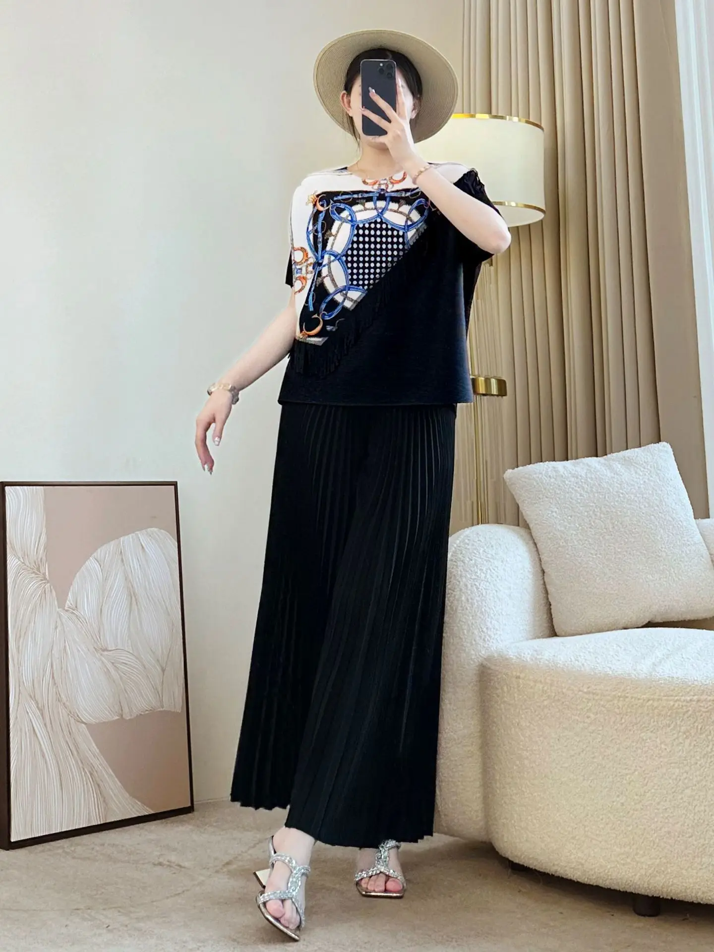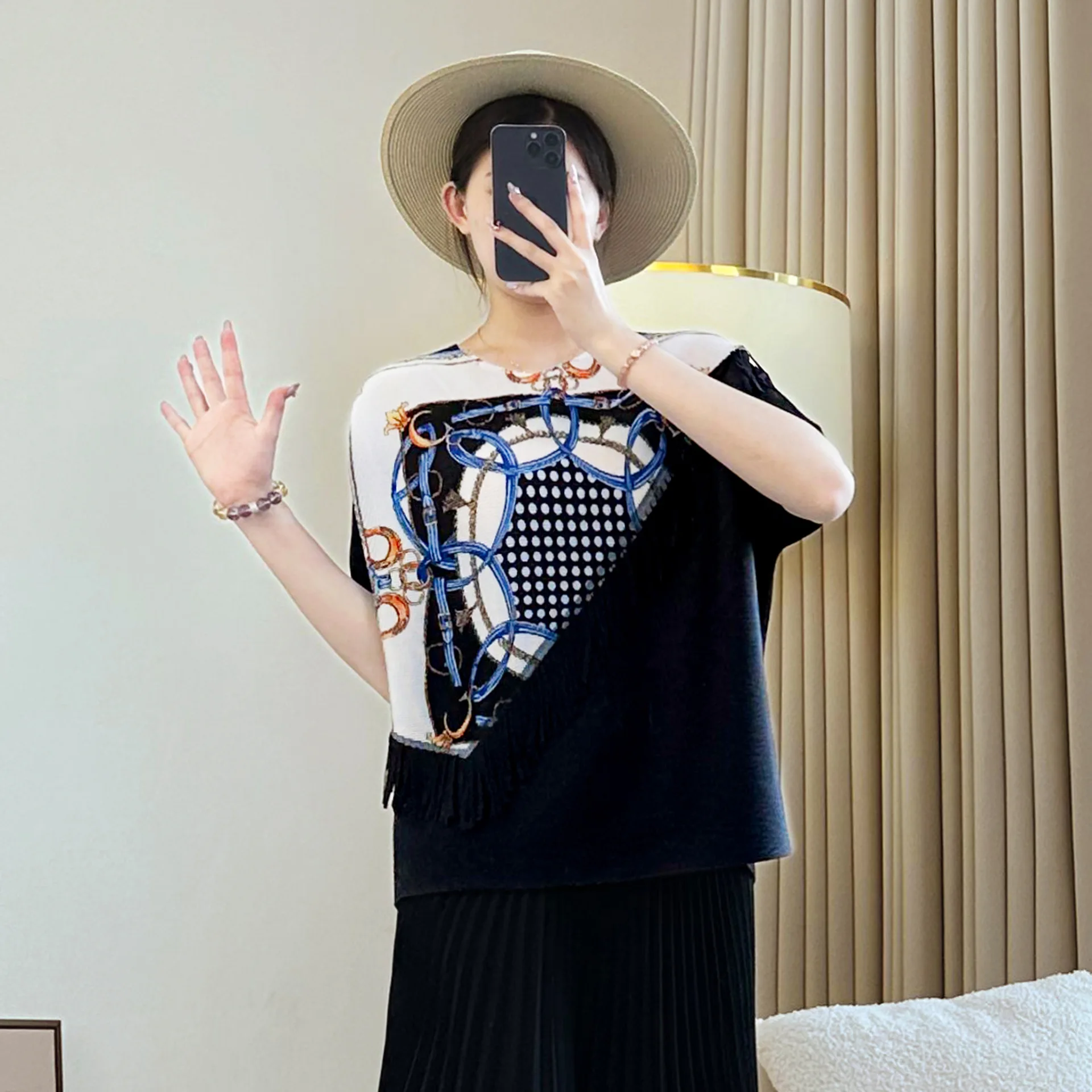 Miyake Generation Women's Summer Short Sleeve T-Shirt New Black Large Size Printed Pleated Belly Covering Loose Polyester Jacket
