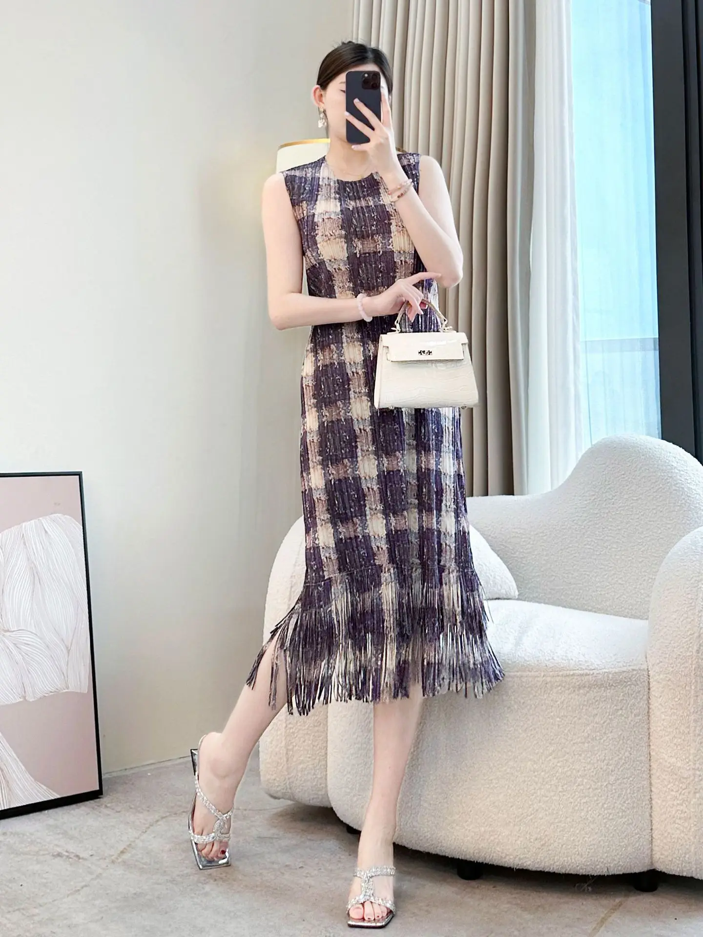 Summer New Sleeveless Slimming High-End Tassel Long Dress Pleated Miyake Plaid Design Casual Chiffon Stretch Large Size Vic