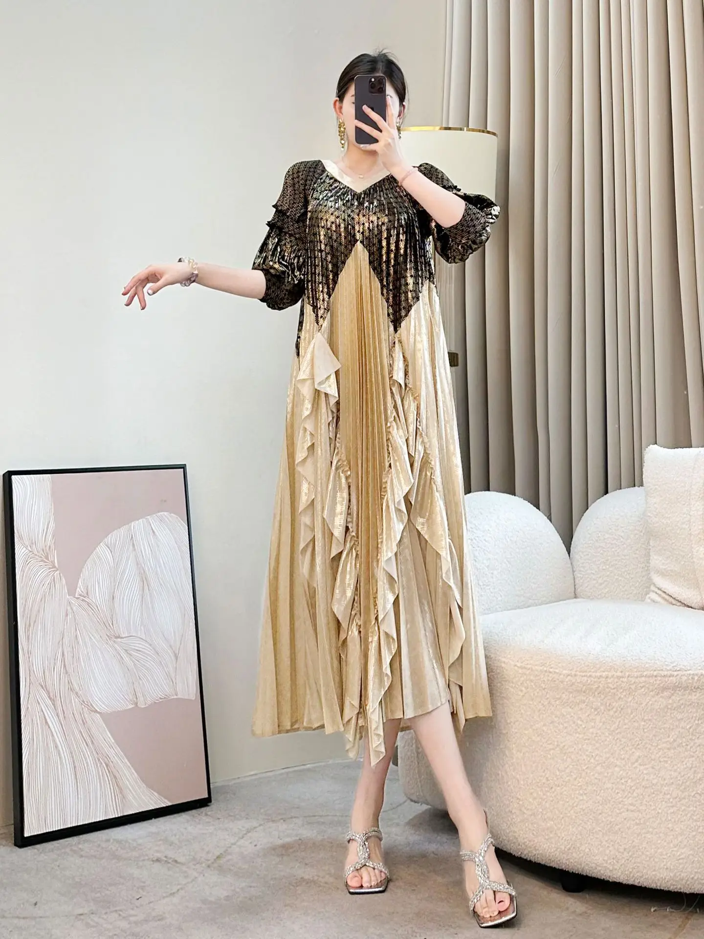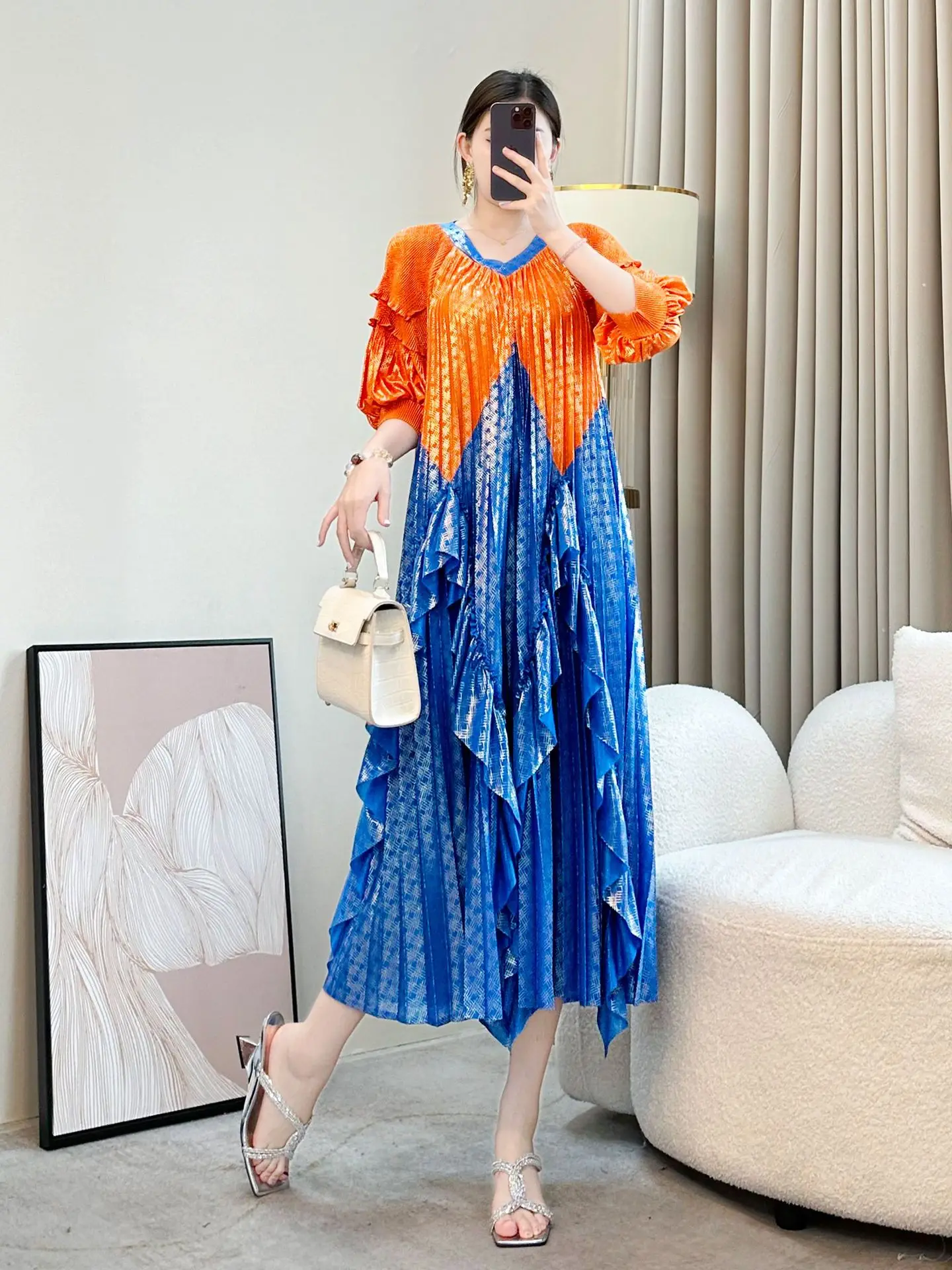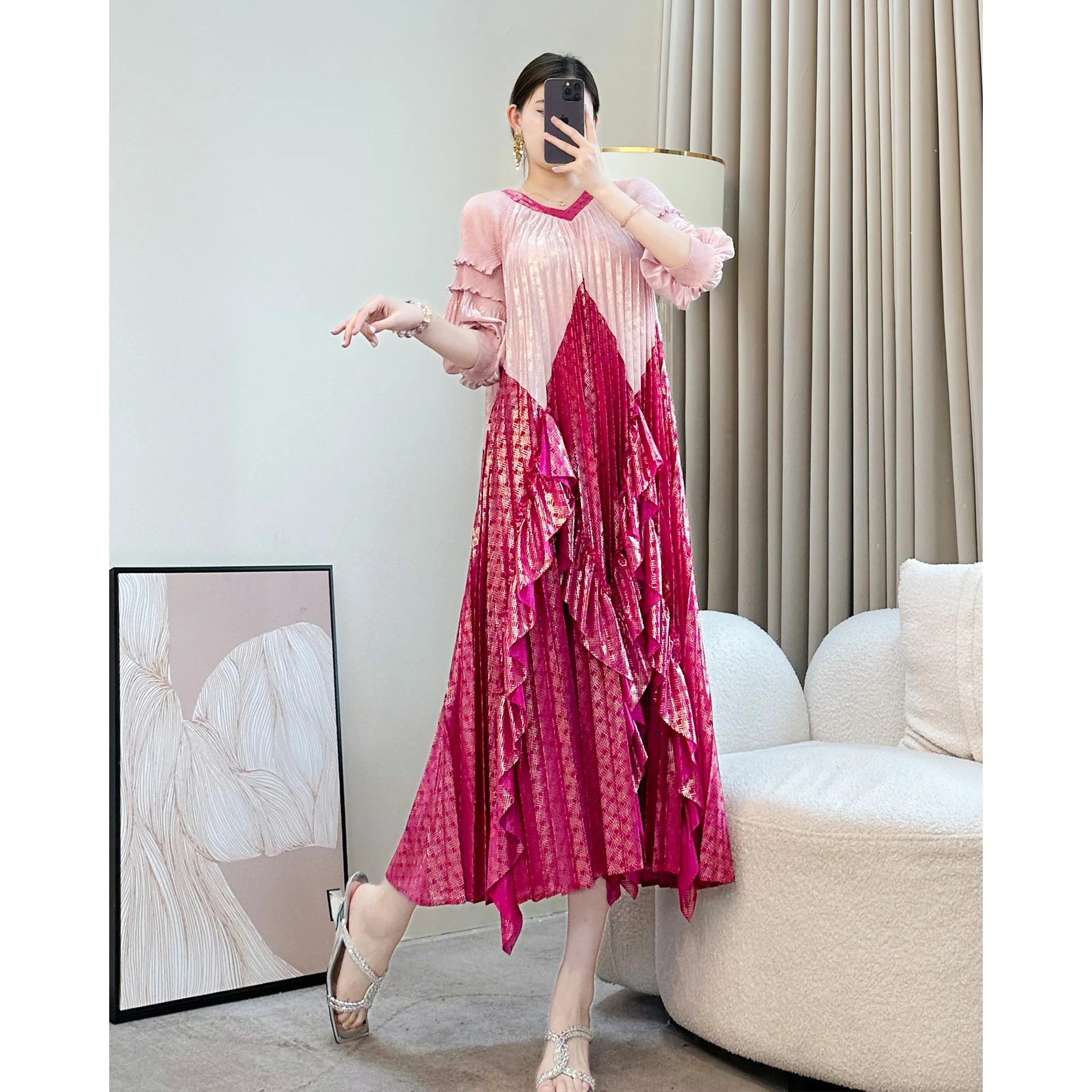 Miyake Elegant High-Level Summer Dress for Mom Color-Matching Pleated Long Dress High Waist Slimming Design Floor-Length Solid