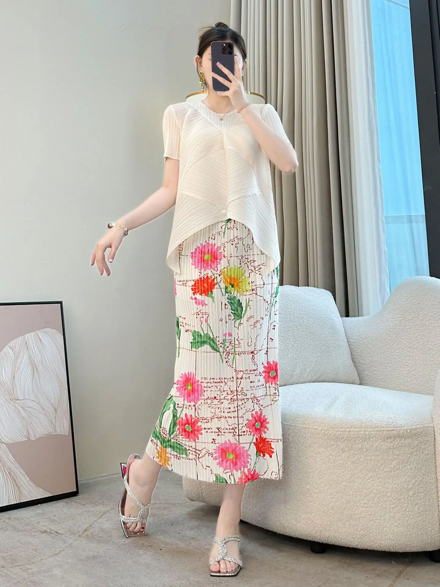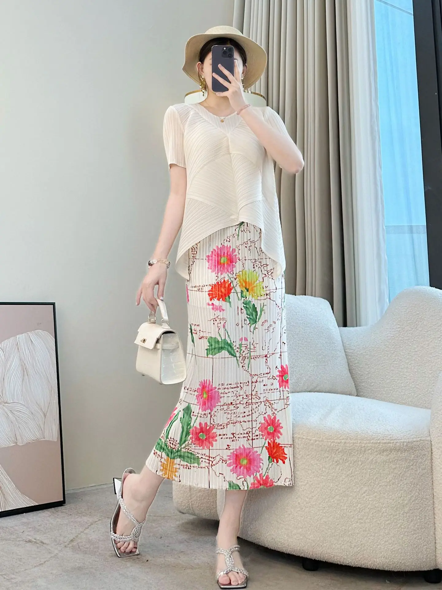 Miyake 2026 Summer Floral Chiffon Pleated Skirt Age-Reducing Straight Style for Women's Seaside Vacation Foreign-Style Floral