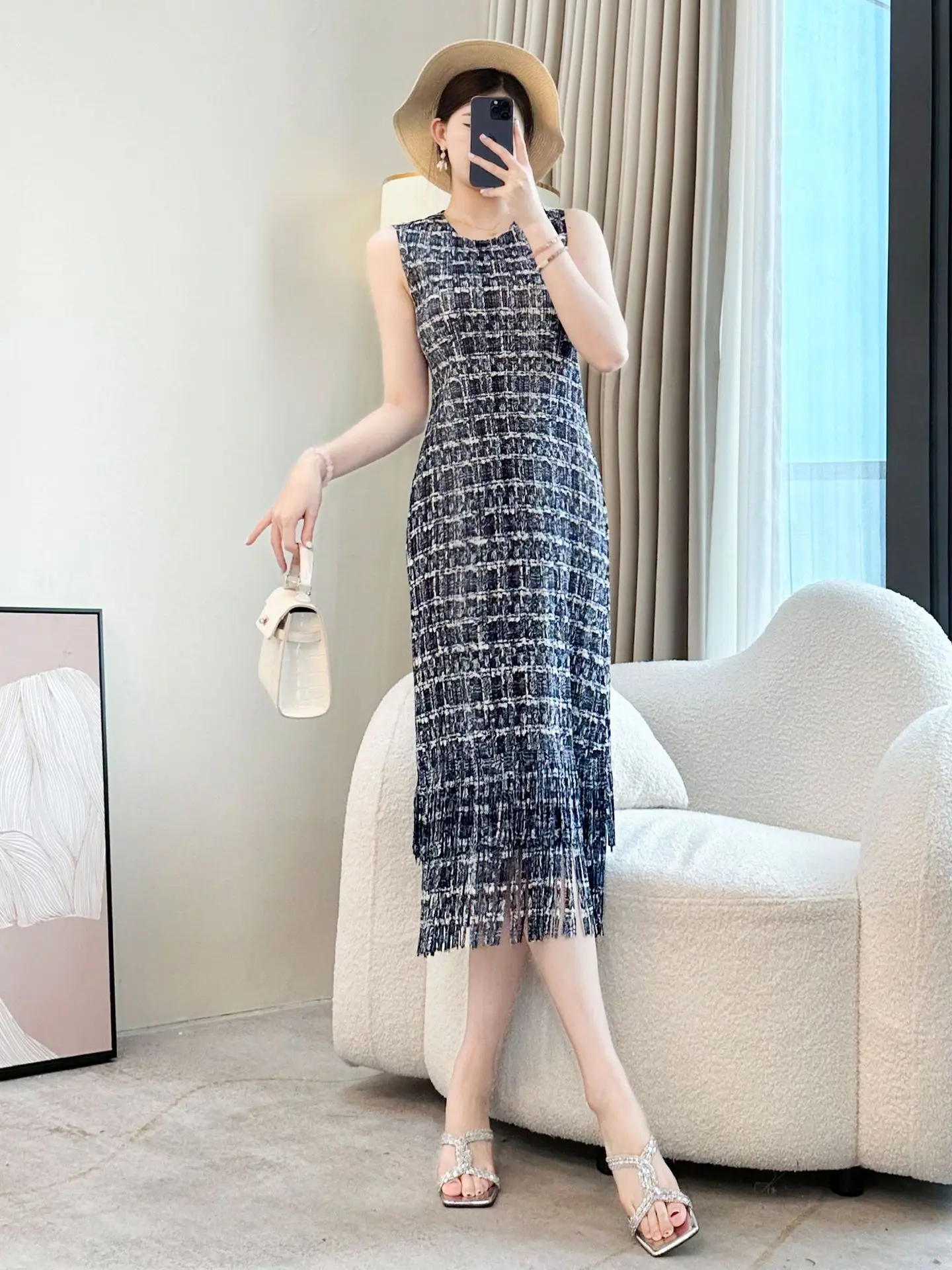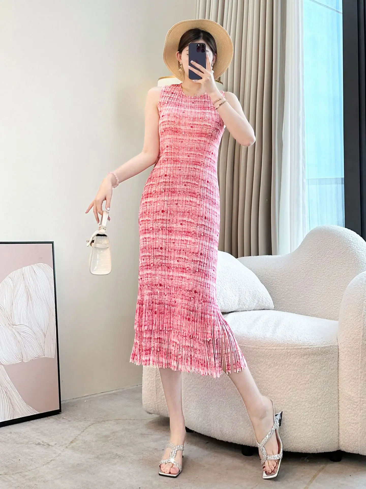 Miyake Casual Summer Dress Pleated Large Size Sleeveless Tassel Dress Pink Seaside Vacation Look with Simple Style