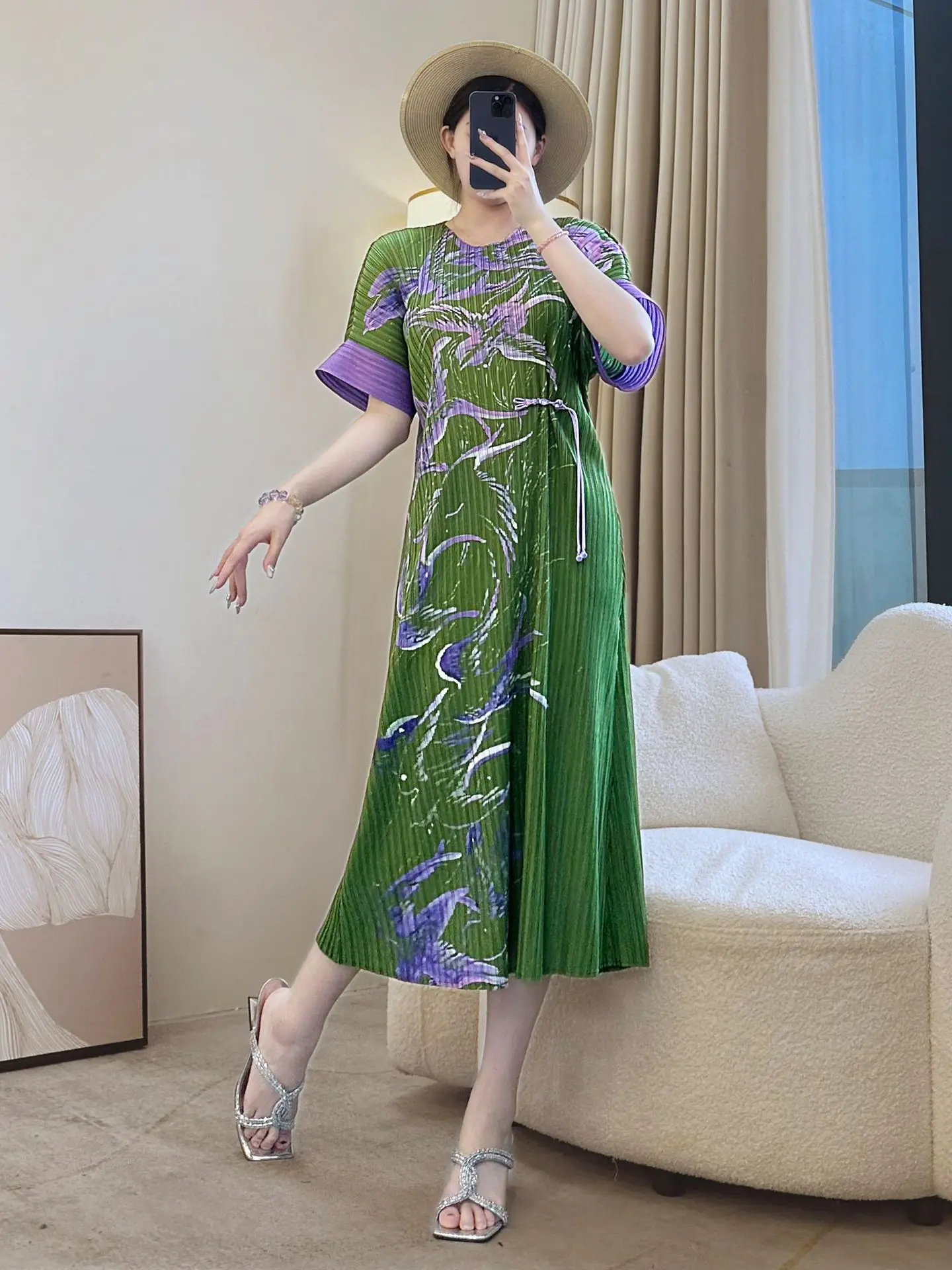 Miyake Age-Reducing Temperament Mother High-Grade Green Pleated Skirt Floral Casual Summer Dress for Large Sizes Generation Hair