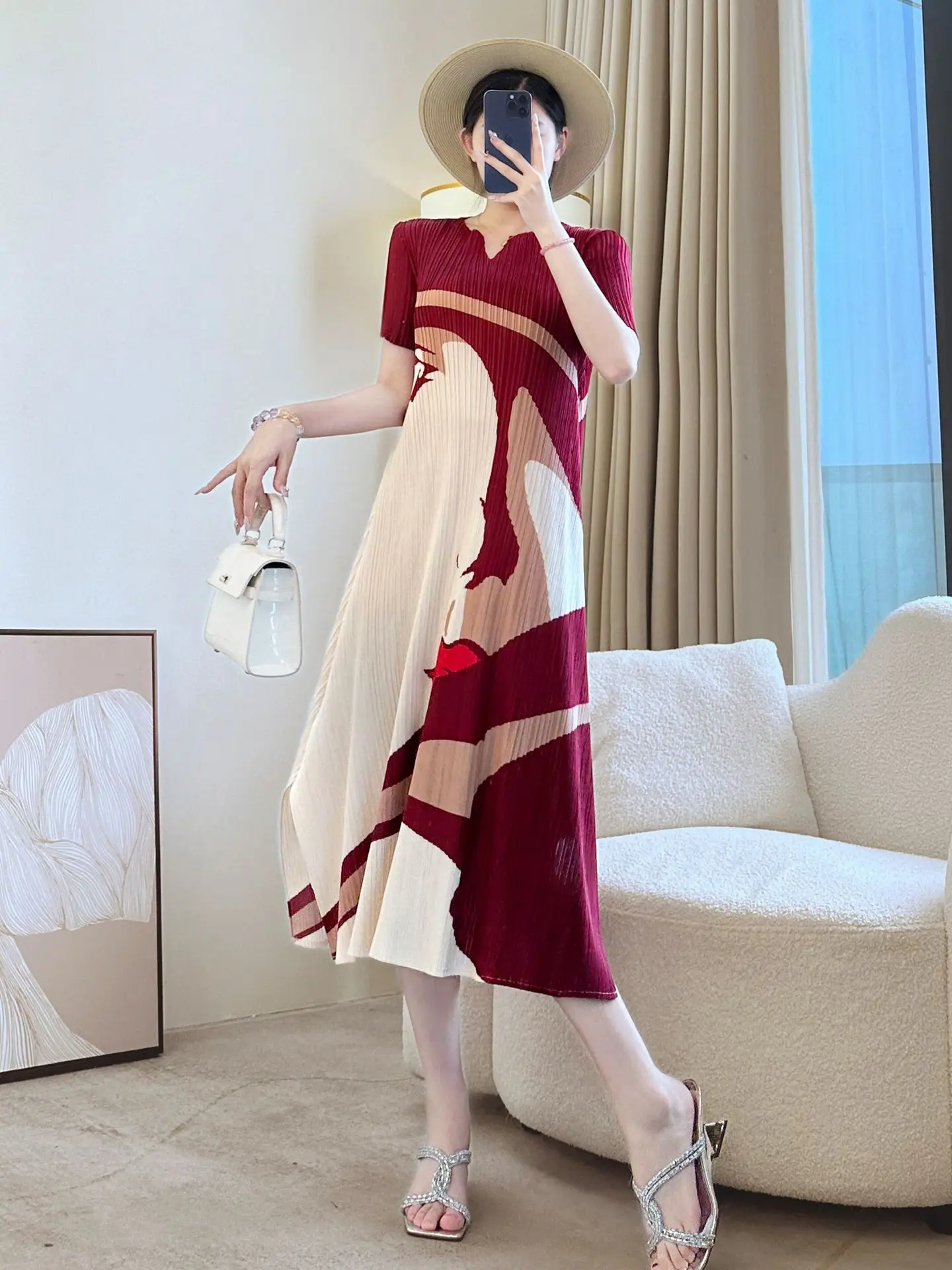 Miyake Women's 2026 Summer New High-End Floral Print Pleated Dress Elegant Mid-Length Age-Reducing Casual Style Chiffon Natural