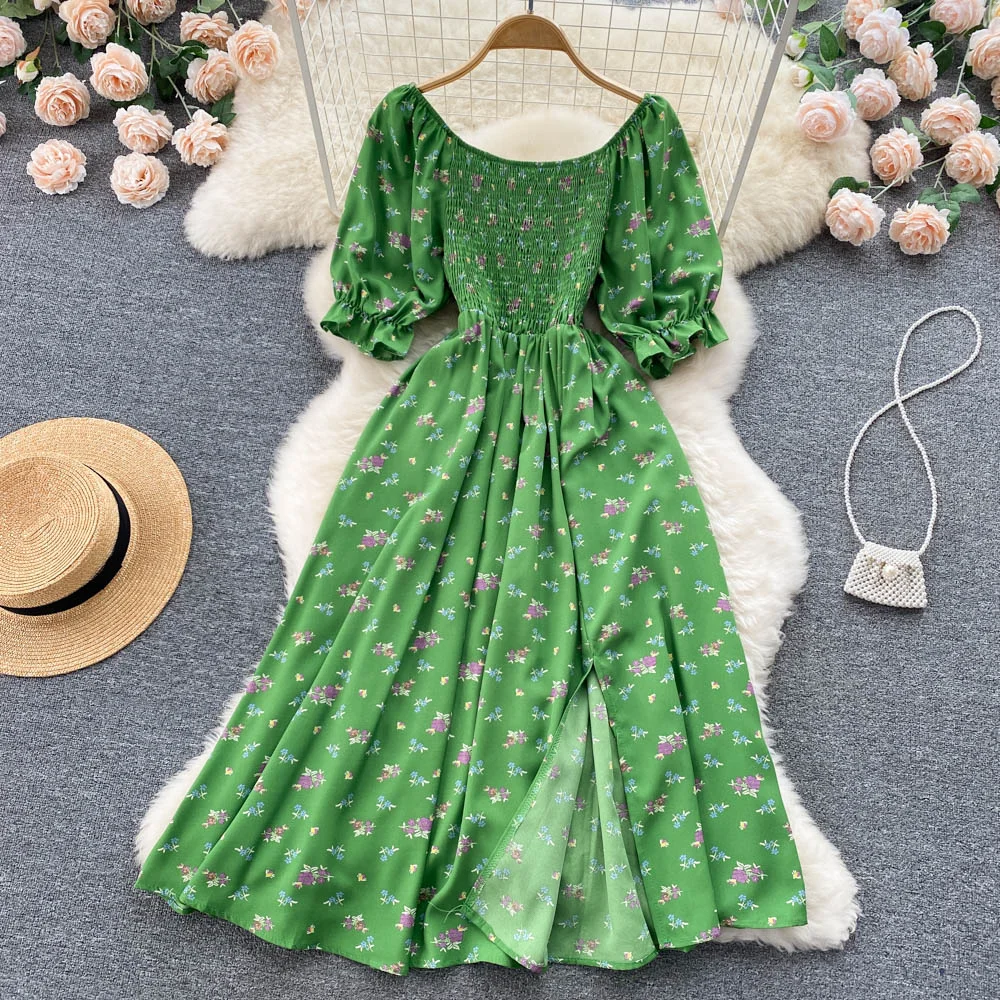Wholesale Ladies Dress for Women Elegant Custom Fashion O-neck Romantic Floral Knitted Printing Split Long Puff Casual Dresses