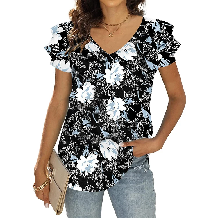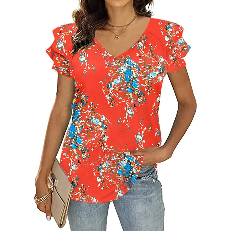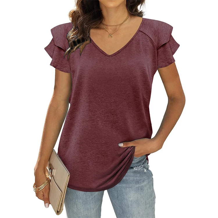 Custom logo Women Summer Designer Clothes Tops for Women Ruffle Short Sleeve Shirt Tunic Tops V Neck Loose Fit Flowy Blouse