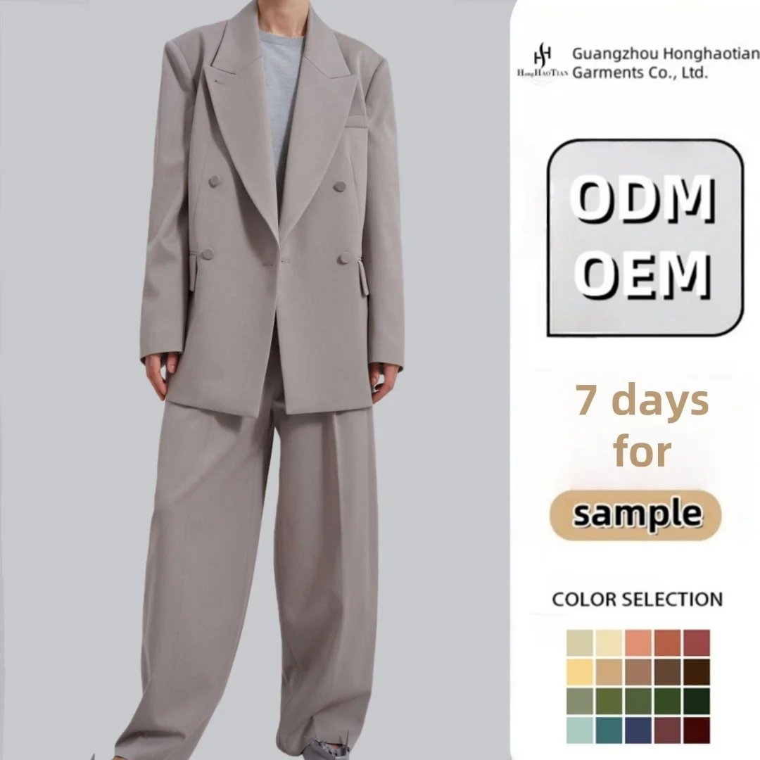 ODM OEM Custom Autumn Women's Loose Casual Double Breasted Suit Jacket and Wide Leg Pant Heavyweight Thick Gray Linens Set