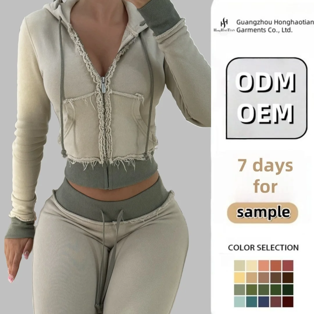 Custom logo Distressed Full Zip up Pullover Towel Embroidery Tracksuit 2 Pieces Cozy Sweatpants and Cropped Hoodie Set for Women