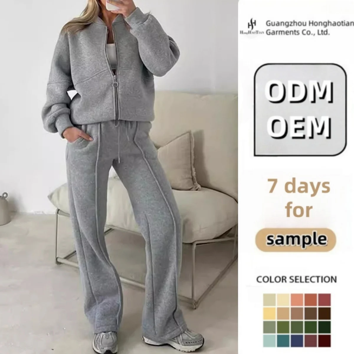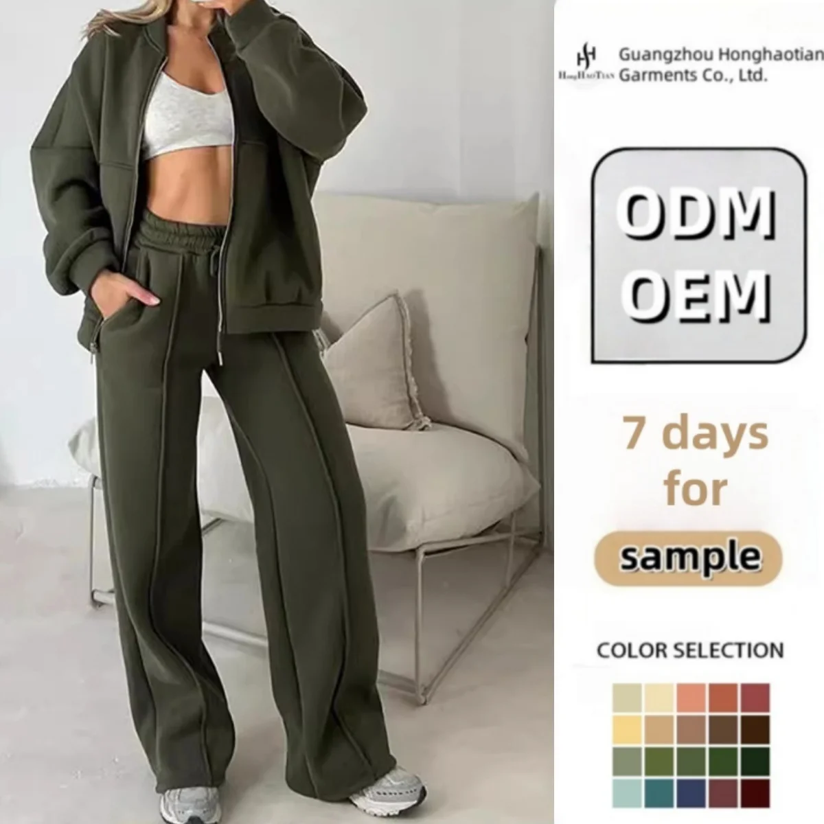 Custom Women's Casual Tracksuit 2 Piece Set Long Sleeve Solid Color Sweatshirt Zip-Up Jogger Pants for Comfortable Lounge Wear
