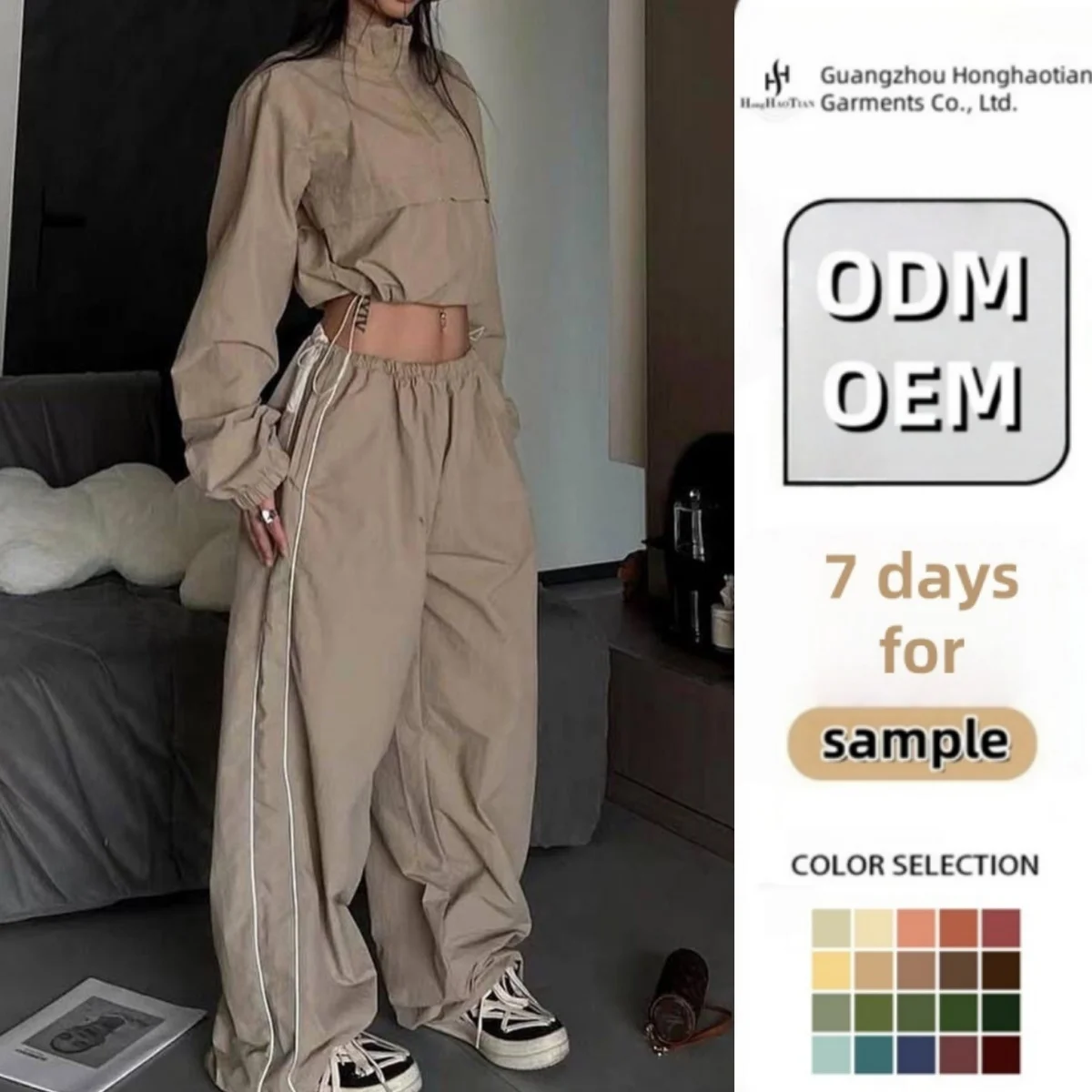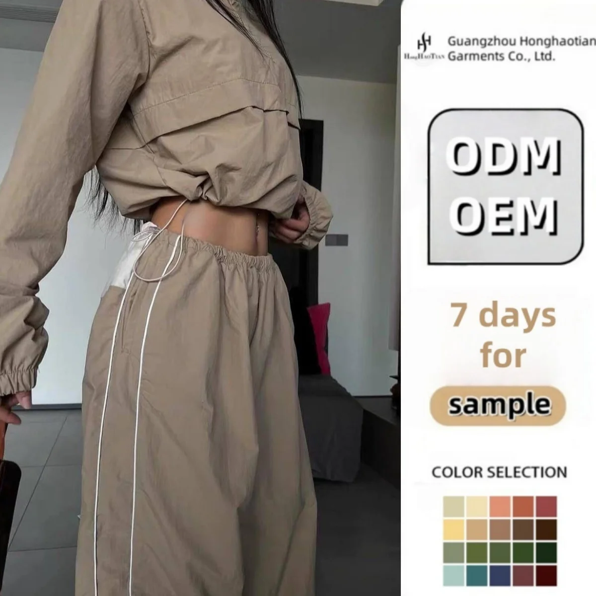 ODM OEM Custom Women's Windbreaker Tracksuit 2-Piece Set with Long Length Sweatpants Striped Hoodie Custom Drawstring Pants Set