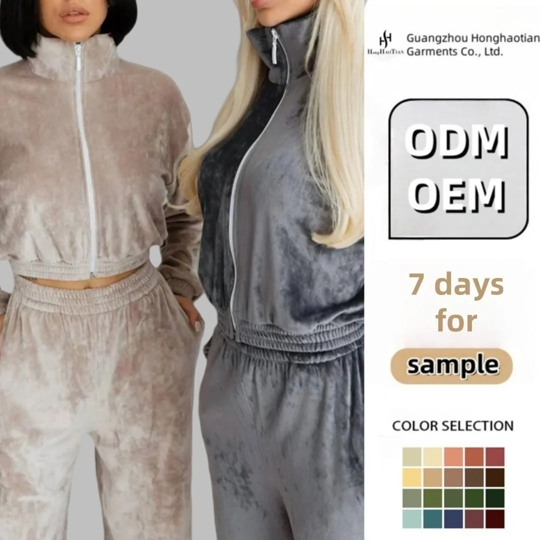 ODM OEM Custom Velvet Sweatsuit Two Piece Flared Pant Cropped Hoodie Sets Zip up Velour Tracksuit Loungewear Set for Women