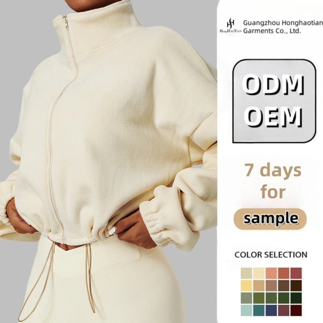 ODM Women's Cropped Fleece Jacket Loose Fit Long Puff Sleeves High Neck Zip up Sports Sweatshirt for Gym Workout Casual Wear