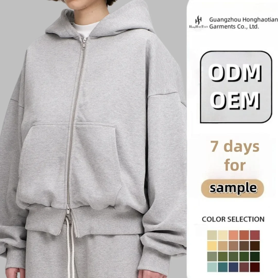 Custom Double Zip up Boxy Hoodie Custom Heavy Weight 470gsm 100% Cotton Cropped Hoodie Men's French Terry Pullover Zipper Hoodie
