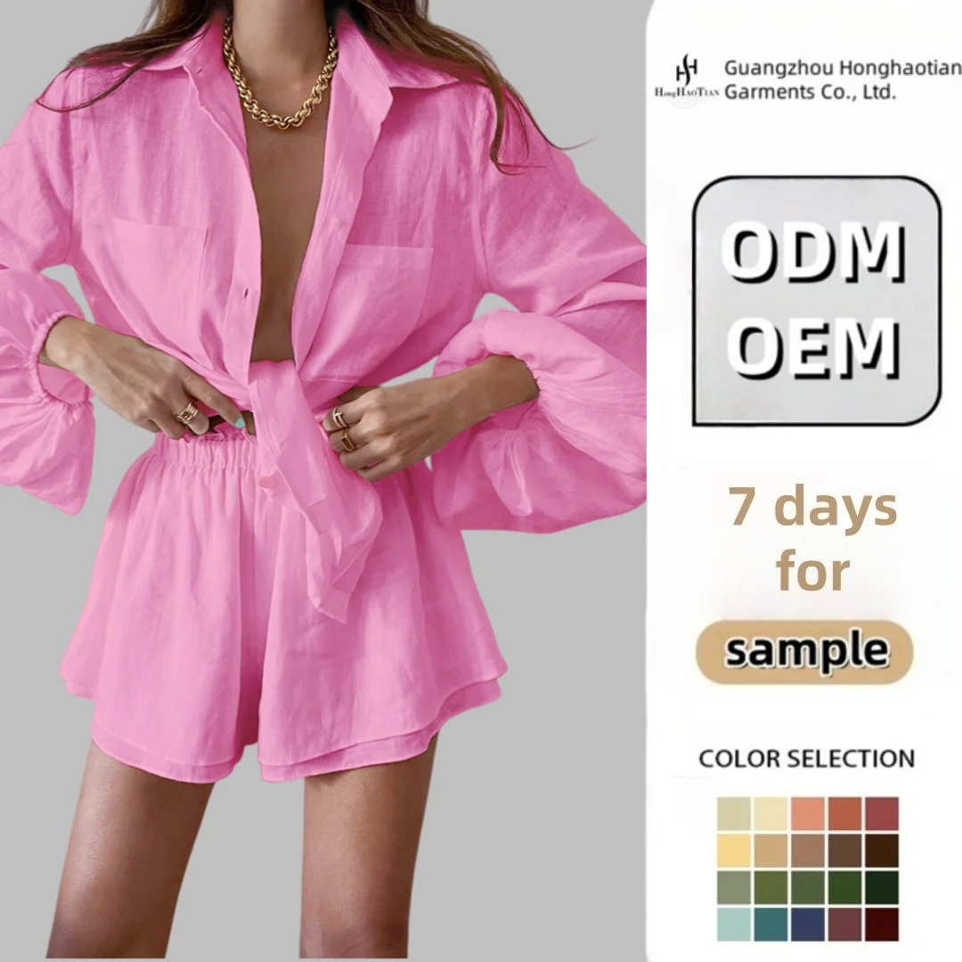 ODM OEM Custom Women's Summer 2-Piece Outfits Ladies Sexy Solid Suits with Long Sleeve Single-Breasted Top Shorts Set