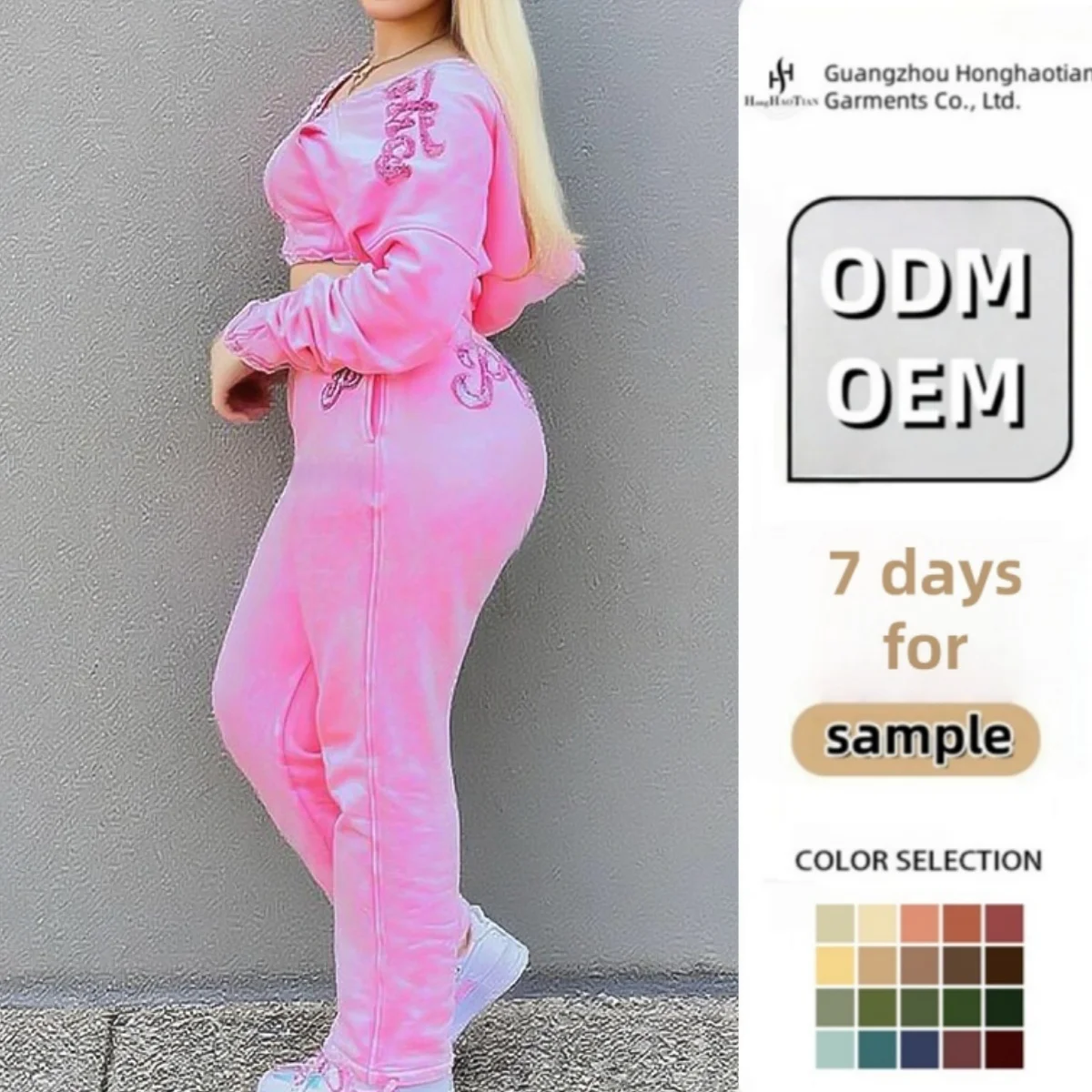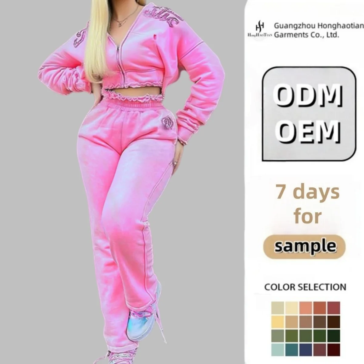 ODM OEM High Quality Custom Fashion Soft Pink Cotton Fleece Patch Embroidery Cropped Women's Full Zip up Hoodies Joggers Set