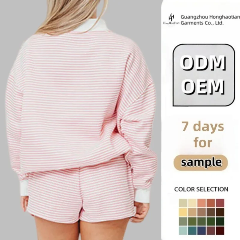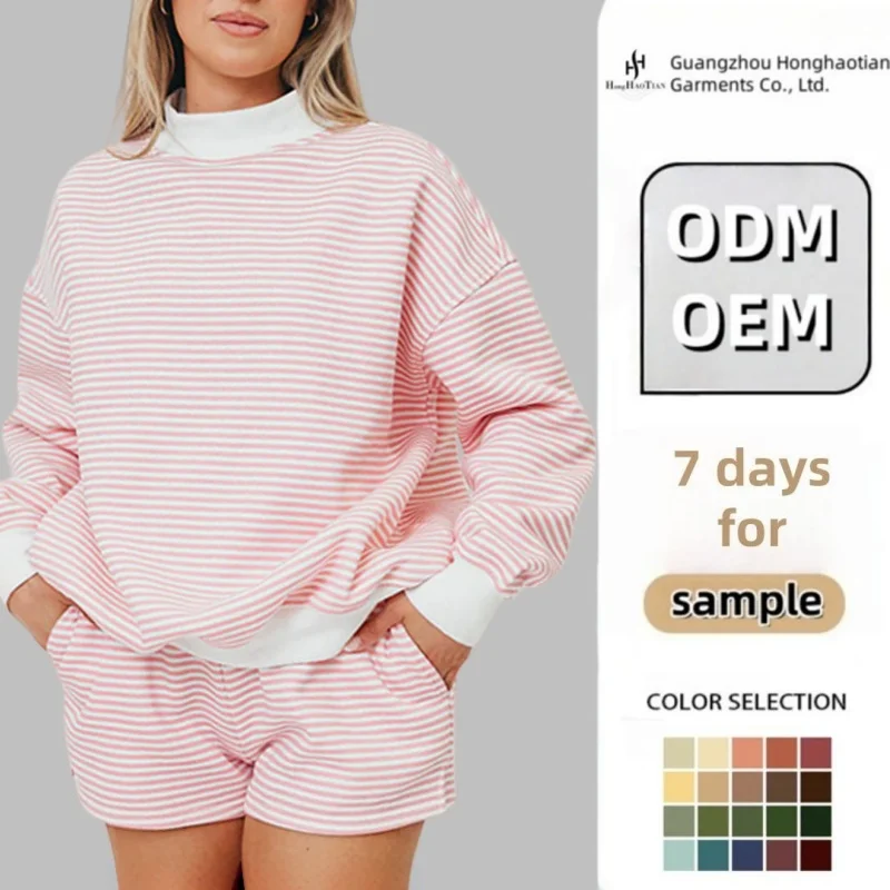 Custom High Quality Oversized French Terry Cotton Plain Striped Mock Neck Sweatshirt Two Piece Sweat Shorts Women Sweatsuit Set