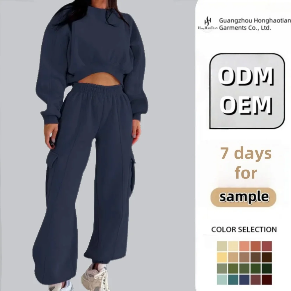 ODM OEM Custom Embroidered Crewneck Sweatshirt Cargo Wide Leg Pants Set Women High Quality 2-Piece Eco-Friendly Polyester/Cotton