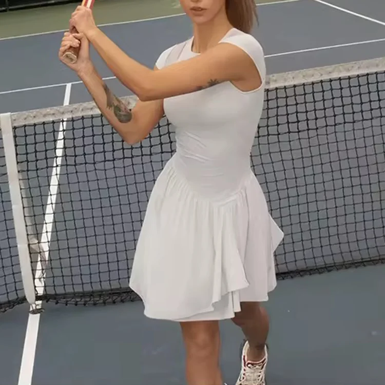 Fashion Round Neck Flying Sleeve Pleated Irregularity Dress Breathable Mesh Summer Sportswear Fitness Tennis Dress Women