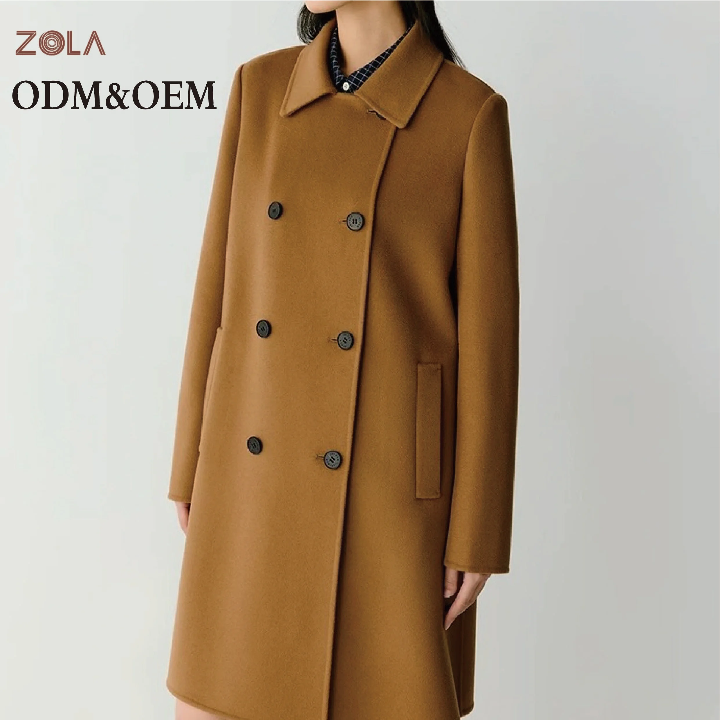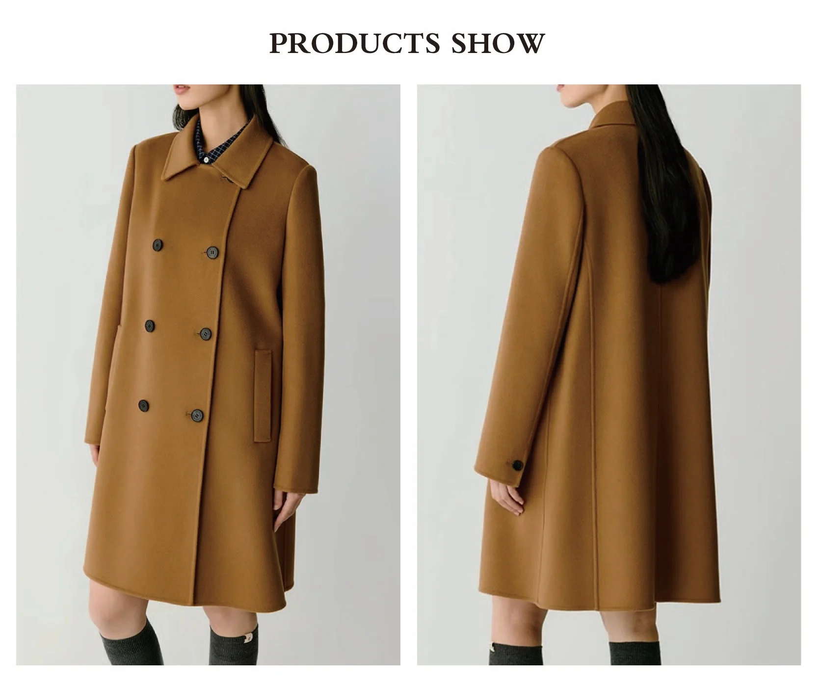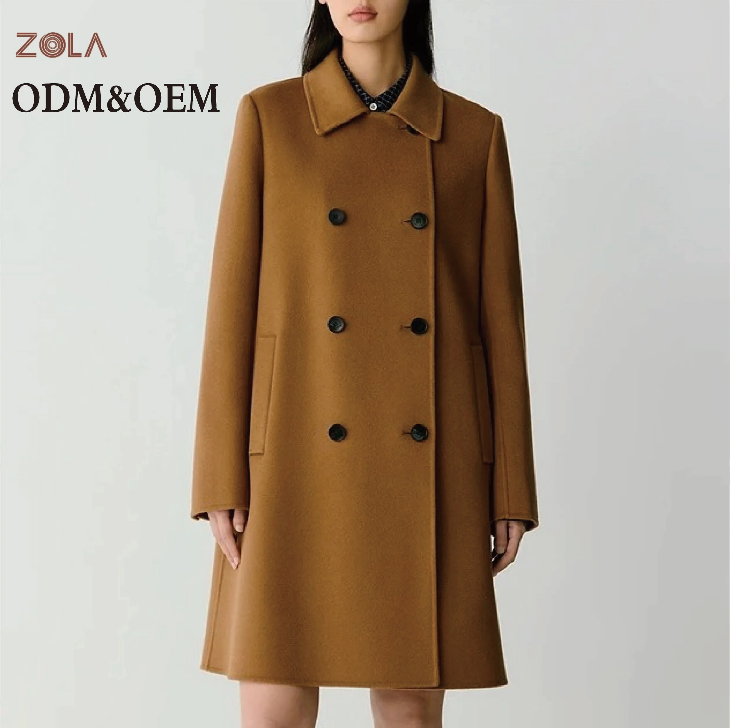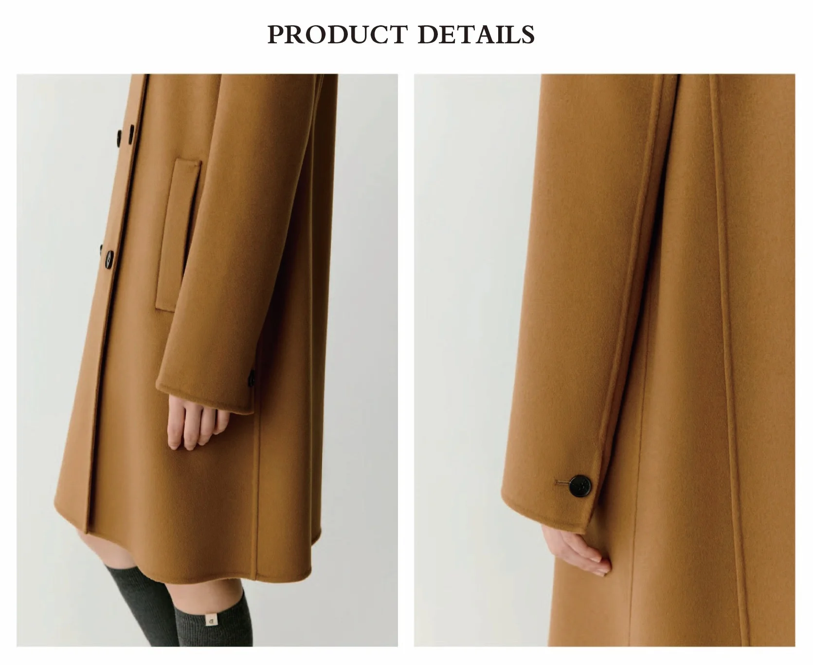 Women's Breathable Double-Breasted Winter Coat Woolen Long Casual Outerwear with Decorative Pocket
