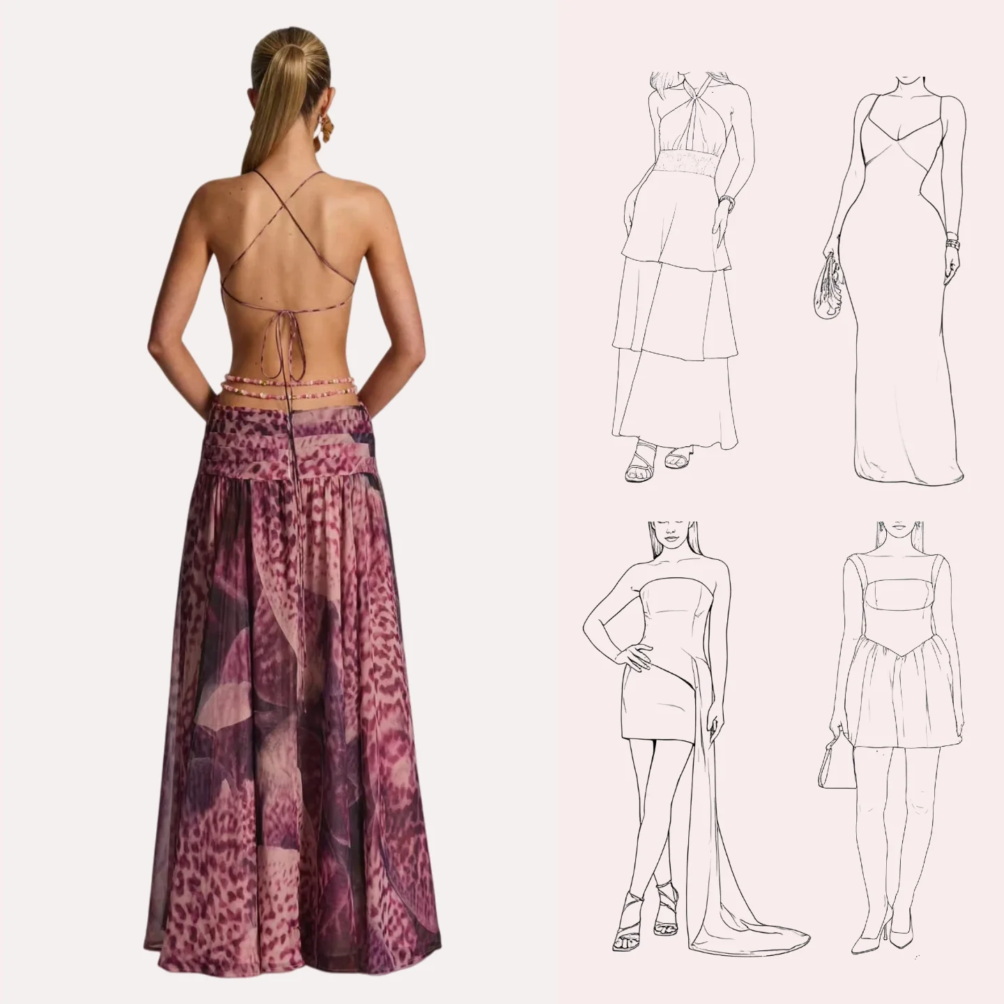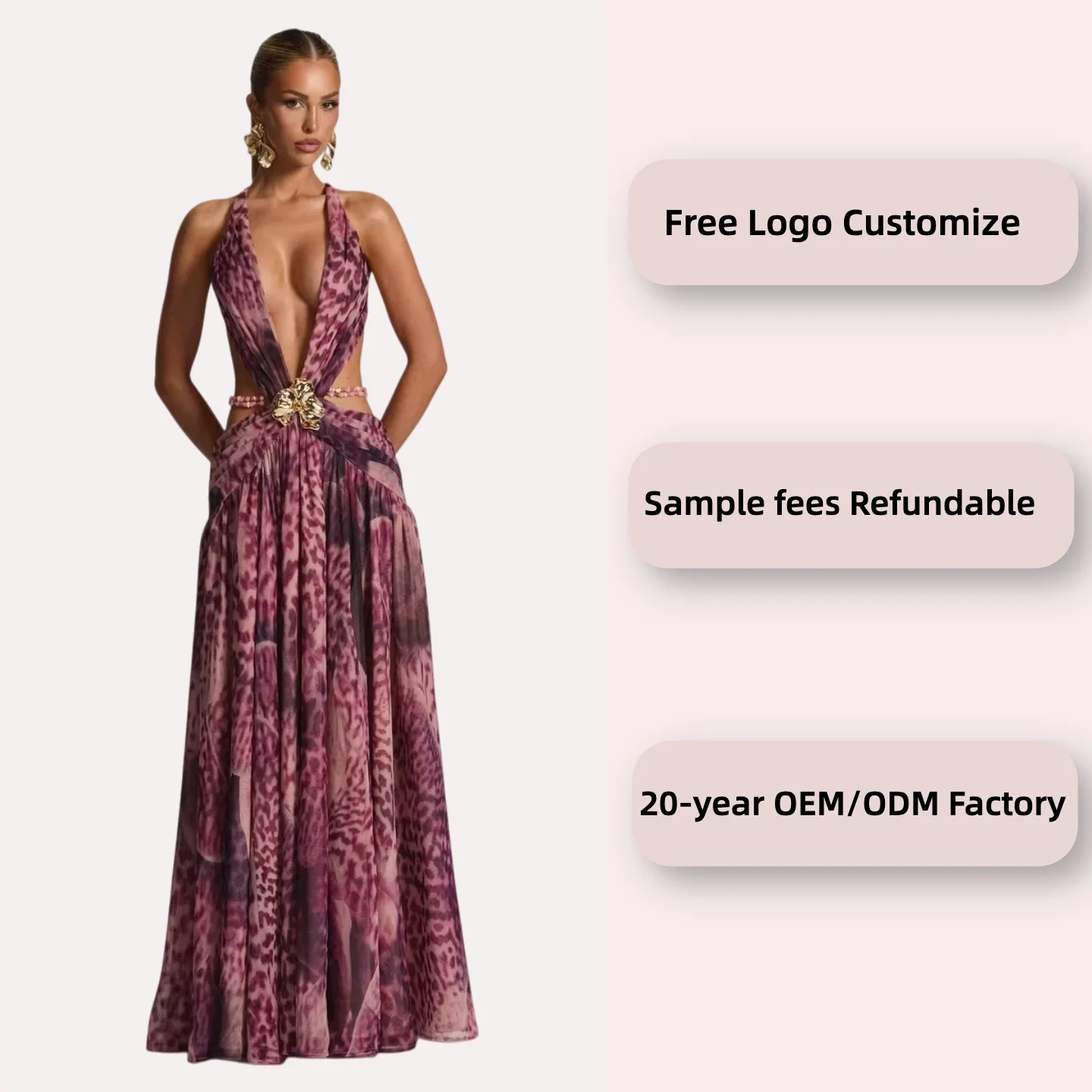 Exclusive Magenta Orchid Print Maxi Dress with Detachable Waist Chains & Backless Design for Wedding Guest or Evening Party Gown