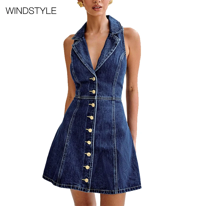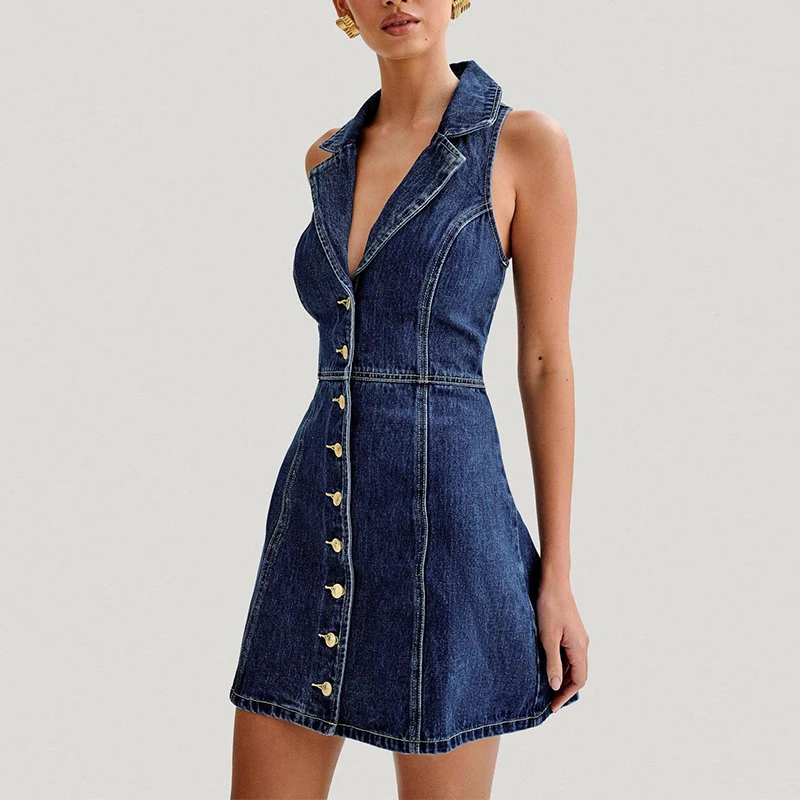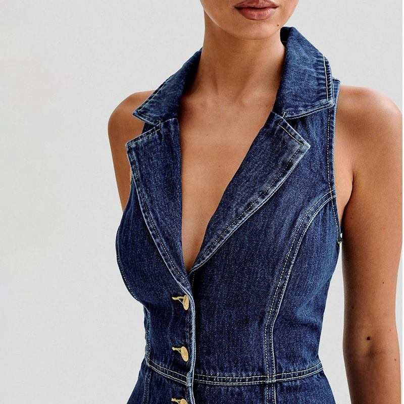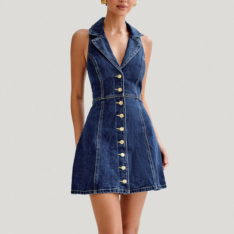 French Temperament Slim Midi Length Dress for Children Casual Floral Woven Breathable Neck Strap Hanging Summer Tea Break Denim