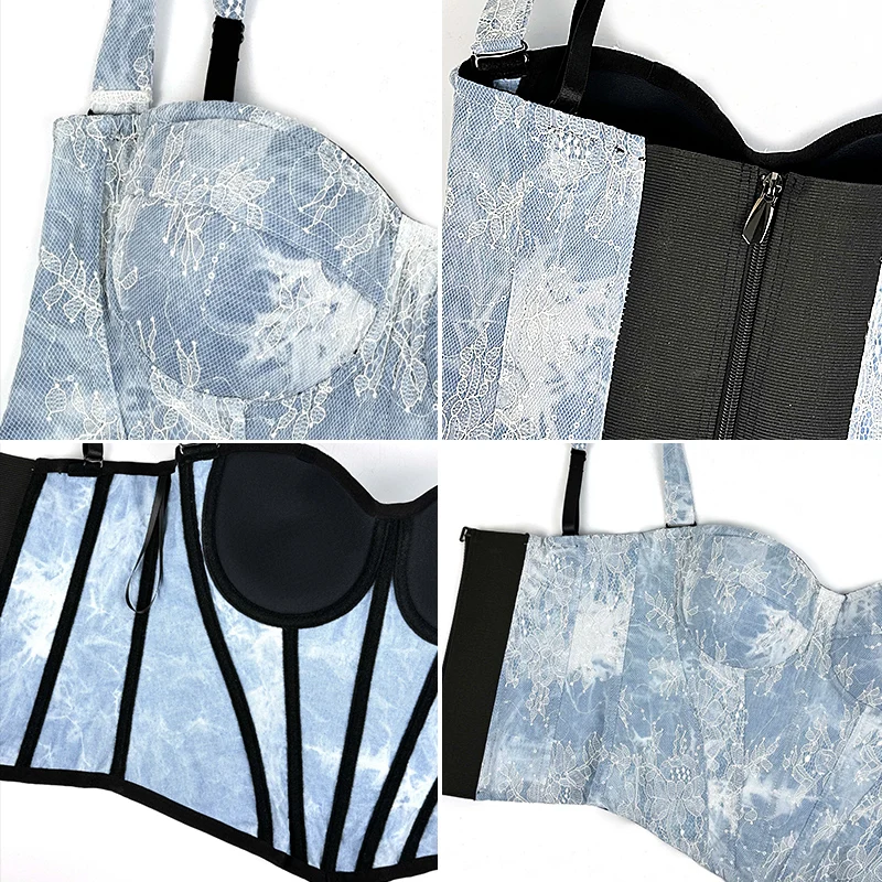 Vintage Floral Embroidered Lace Crop Top Breathable Skinny Body Shaping Strapless Halter Short Square Collar Sexy INS Style