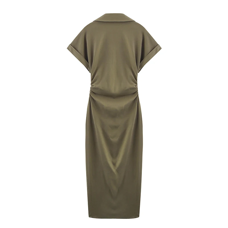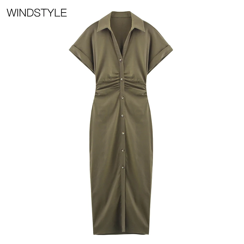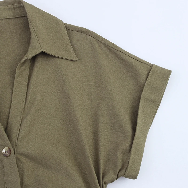 Women's Casual 100% Cotton Denim Dress Pleated Waist Short-Sleeve Knee-Length Woven Breathable Solid Autumn Spring Summer Slits