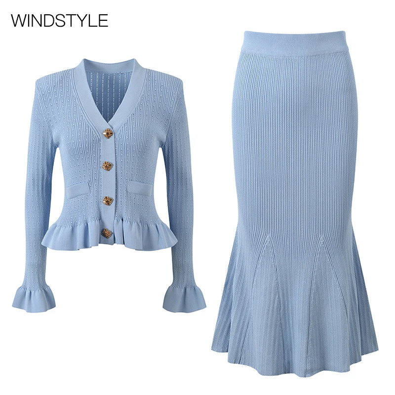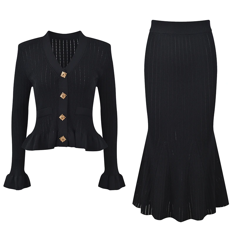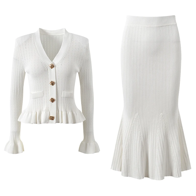 Autumn Formal Slim Suit with Single-Breasted Top V-Neck Wooden Ear Cuff Hem Hip Fishtail Skirt Solid Knitting Fabric