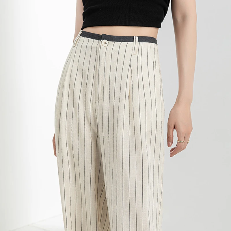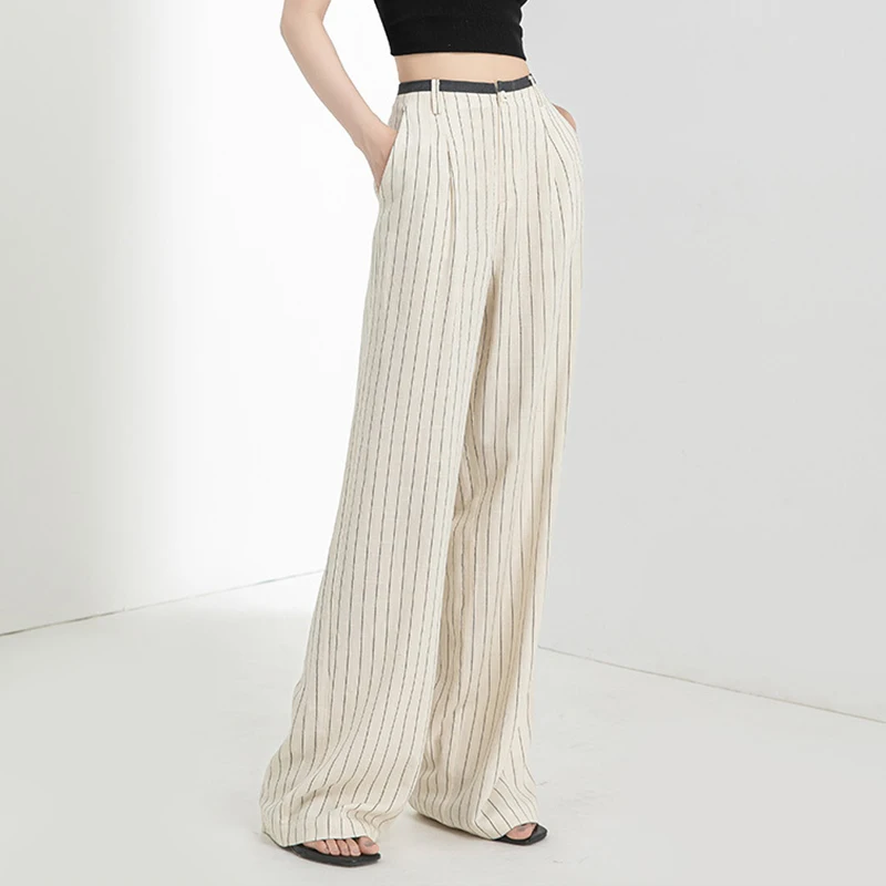Linen Summer Ladies Casual Joker Striped Wide Leg Pants High Waist Slimming Design Formal Style Thin Women's Suit Pants