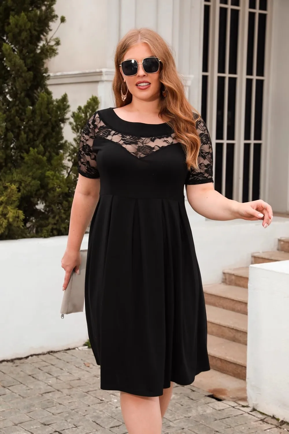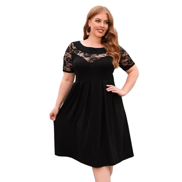 2026 Hollow Lace Casual Loose Plus-Size 100% Polyester Eco-Friendly Empire Waist Fashion Pleated Short Sleeve Midi Dress Women