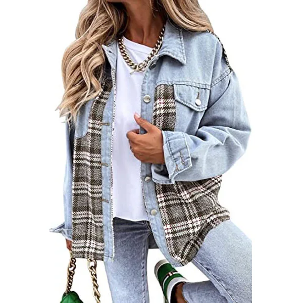 Women's Denim Jacket Long Sleeve Plaid Patchwork Button Down Waterproof Eco-Friendly Breathable Color-block Shacket