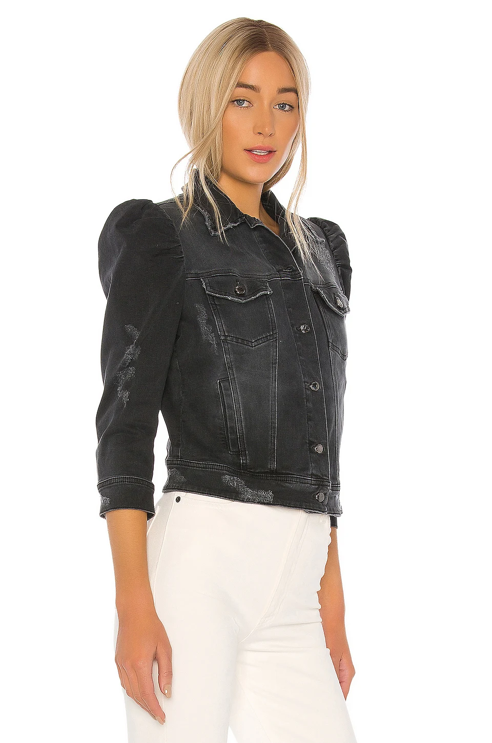 Latest Women's Denim Jacket Puff Sleeve Frayed Distressed Bleach Stone Washed Girls Blue Denim Jackets