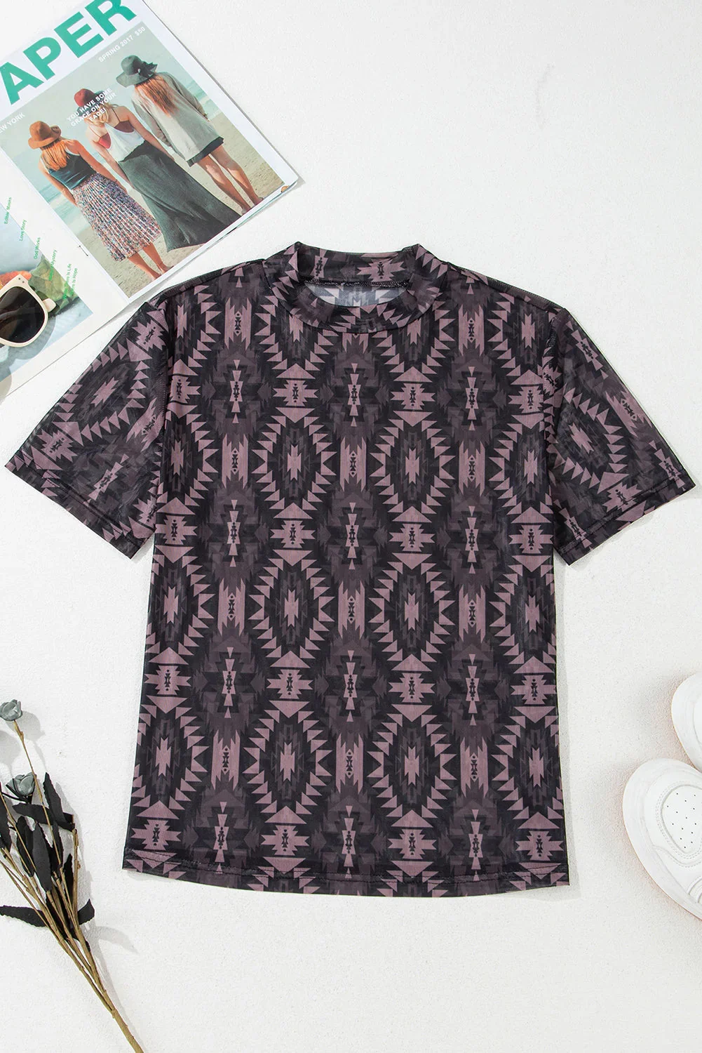LYG Summer Bestseller Casual Mid-High Neck Fitted Base Short Sleeve Top Western Cowboy Aztec Print Breathable Mesh Design