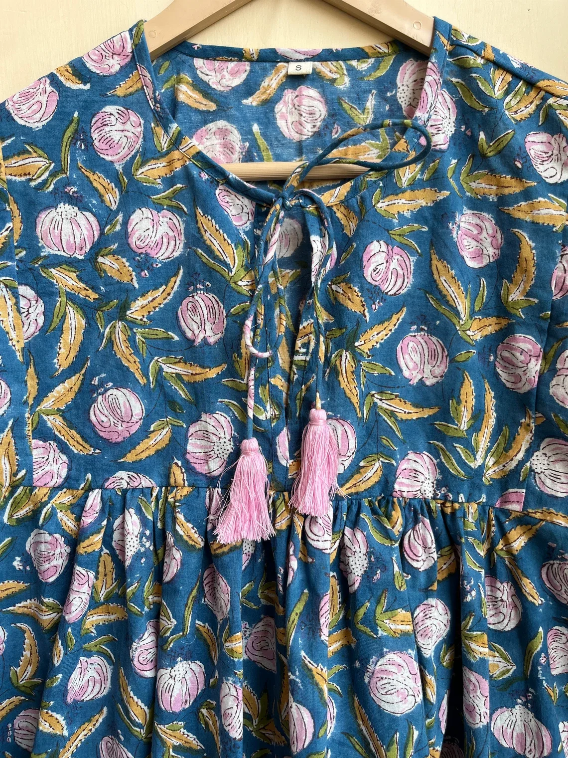 Floral Block Print Tunic Top Round Neck with String Closer Hand Block Print Long Sleeve Casual Top For Women Gift For Her