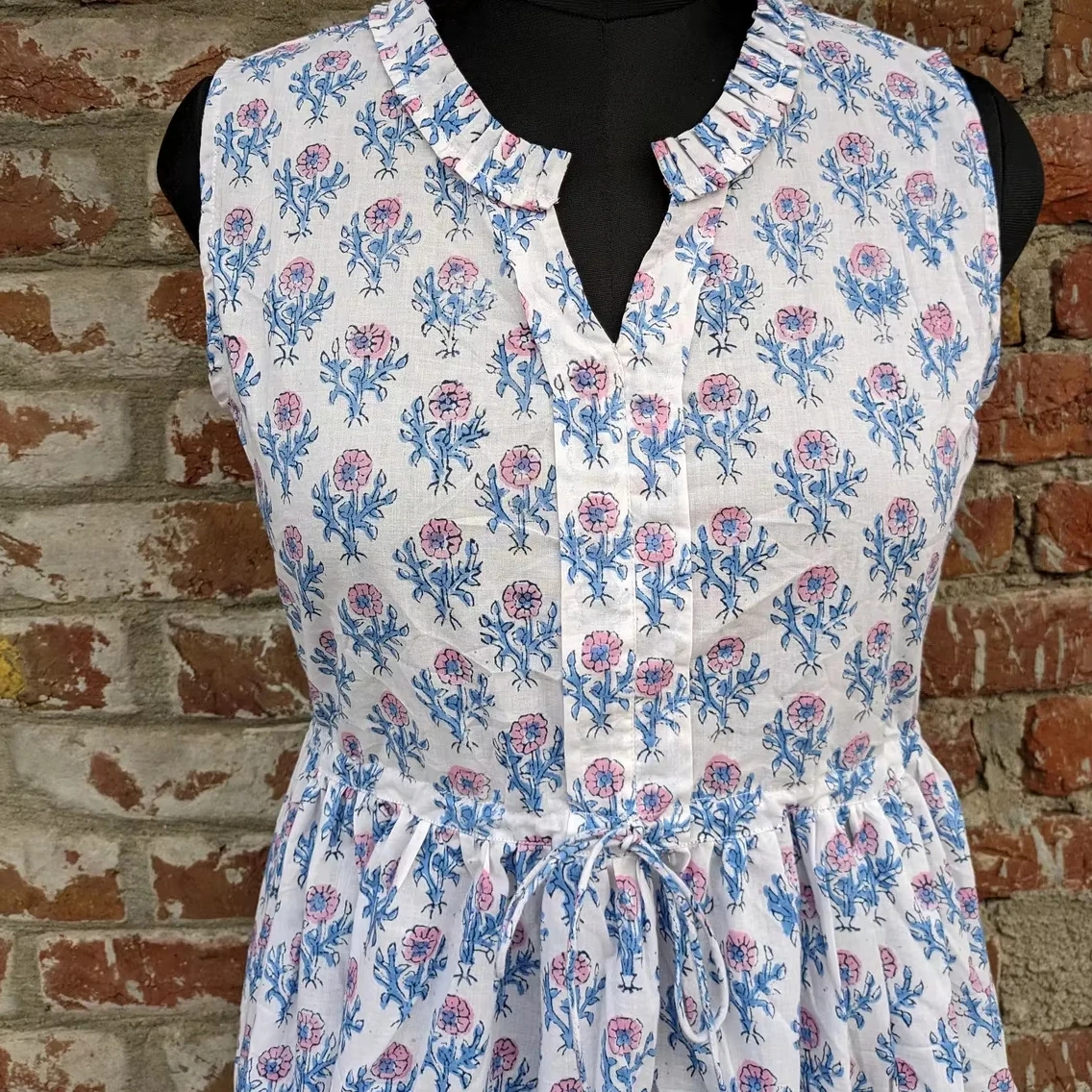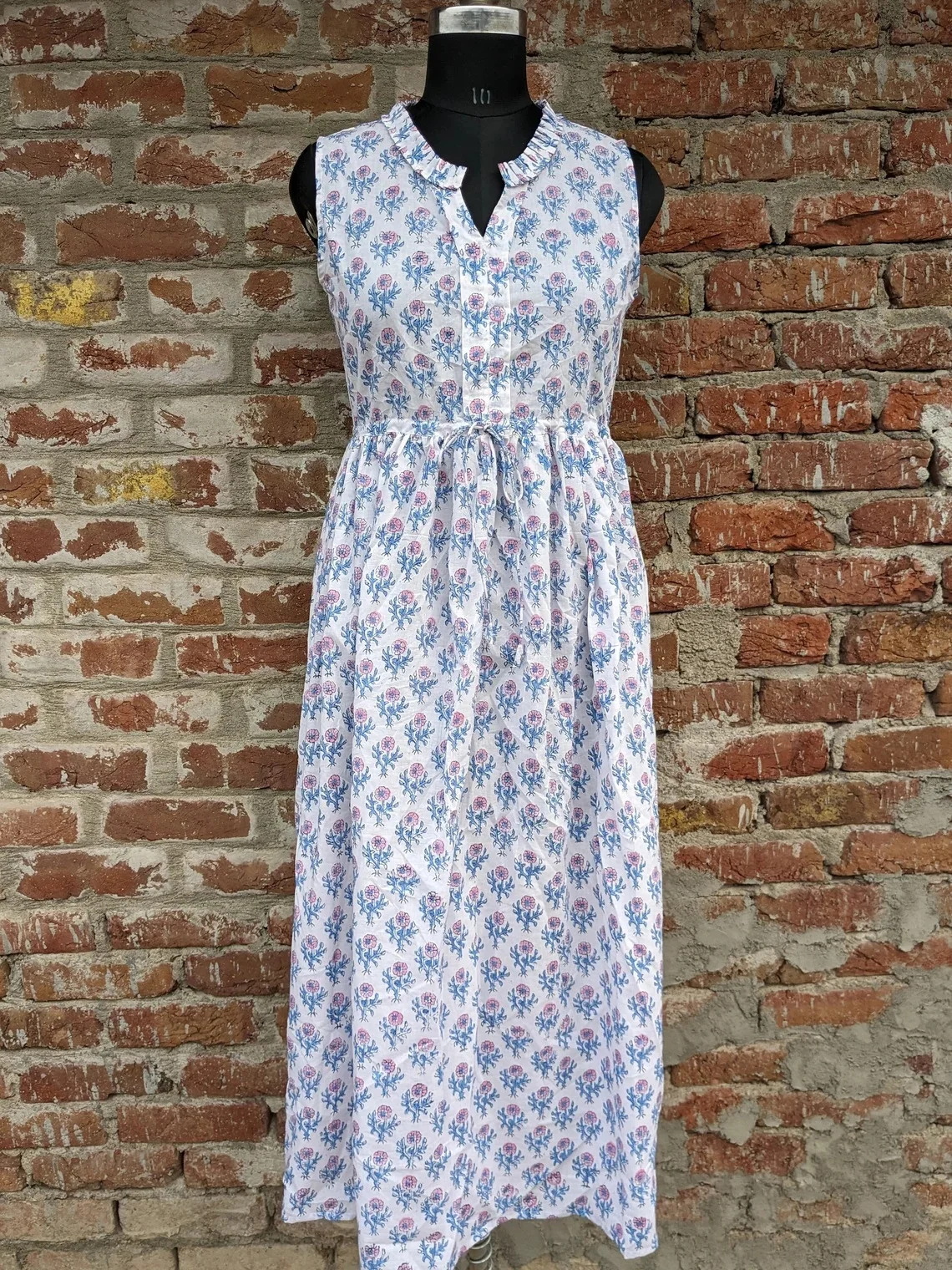 Hand Block Printed Summer Dress V-neck Sleeveless Cotton Dress Floral Print Handmade Long Maxi Dress For Women