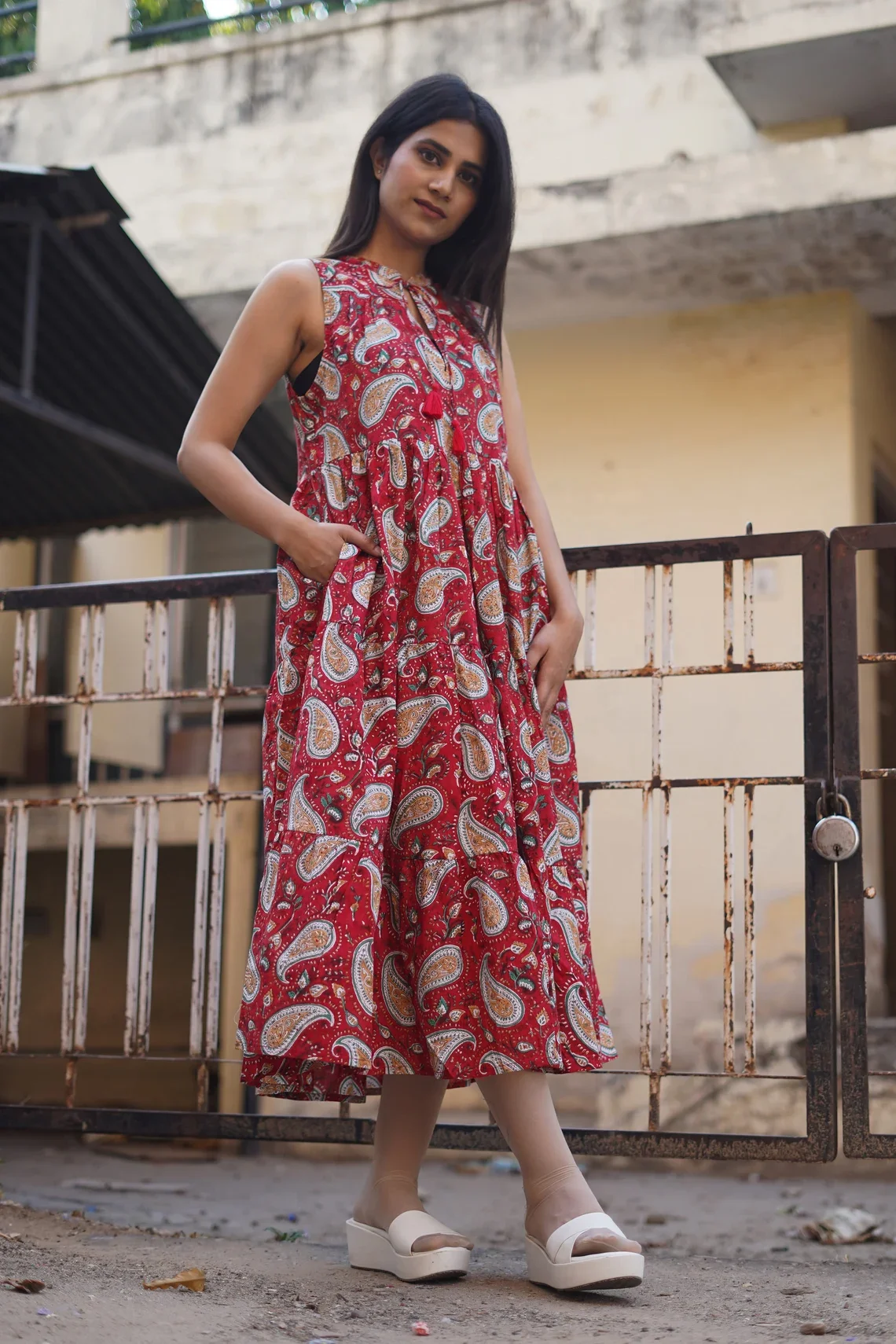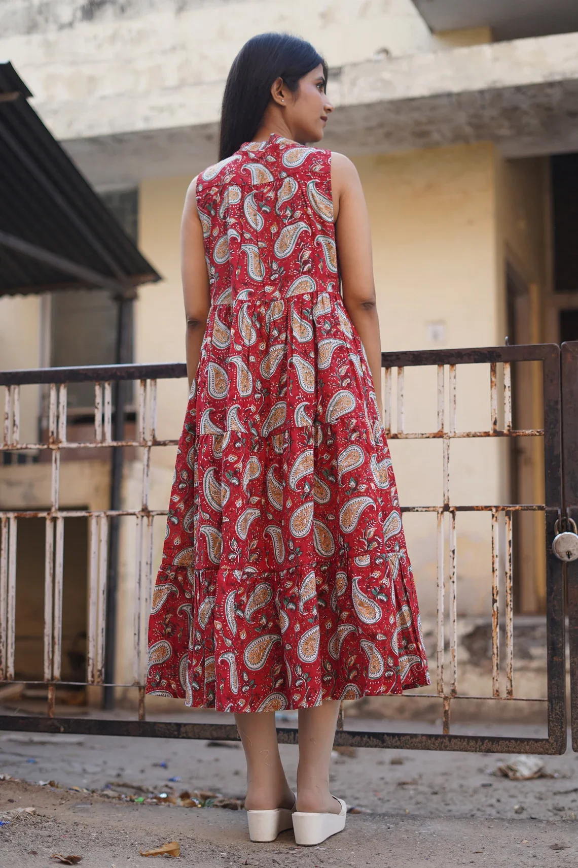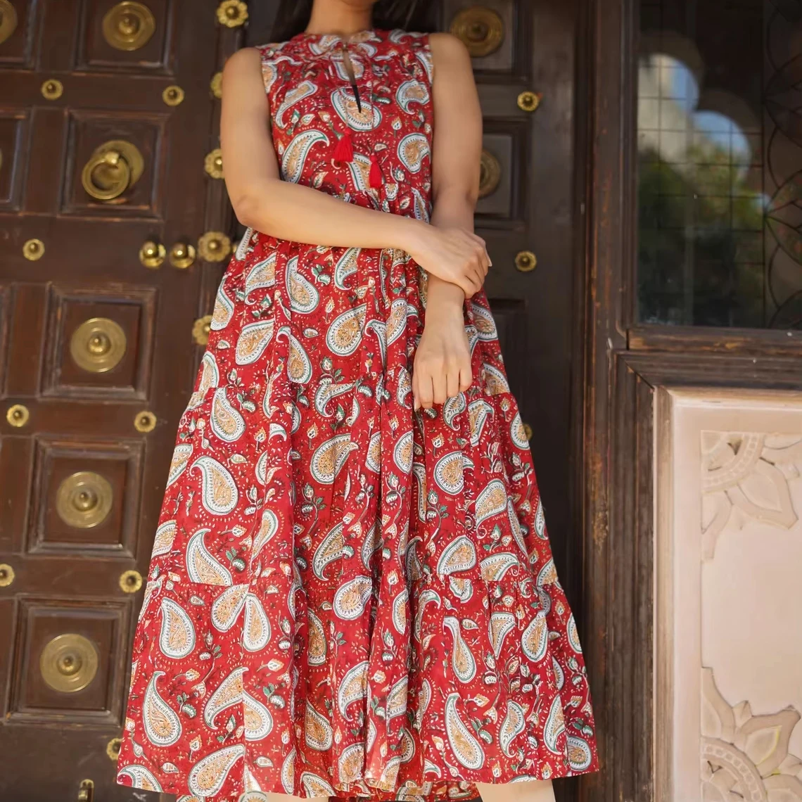Women Cotton Summer Dress Hand Block Print Cotton Tier Dress Mandarin Collar Sleeveless Long Maxi Dress For Summer Season