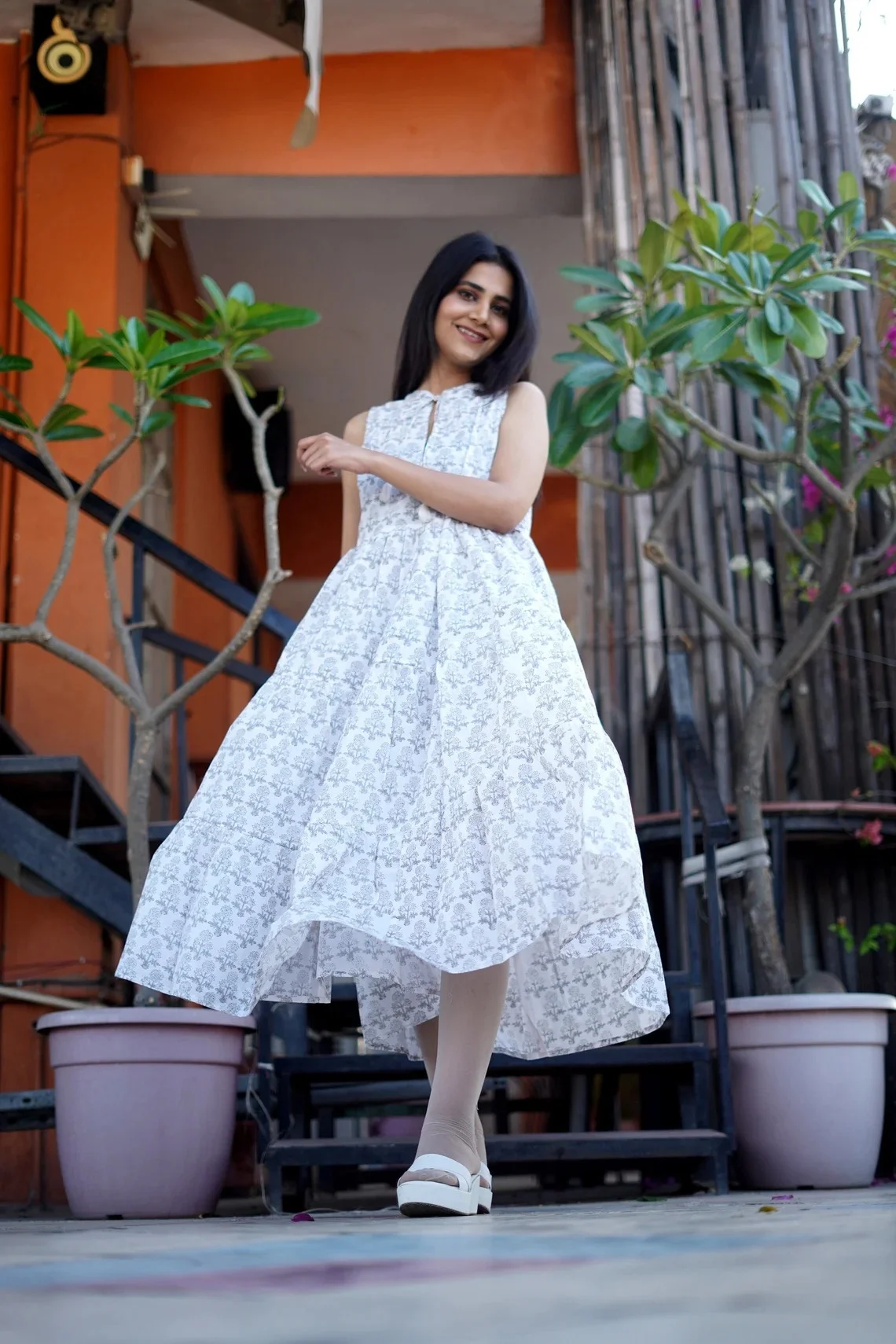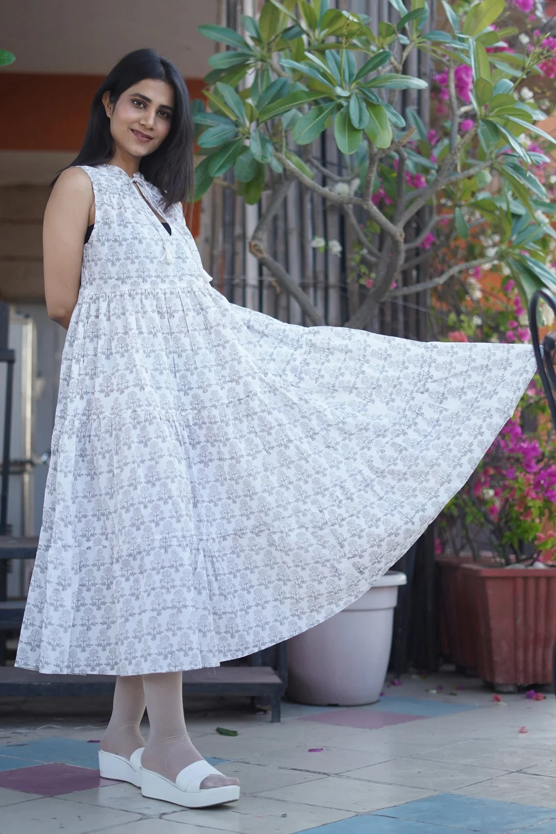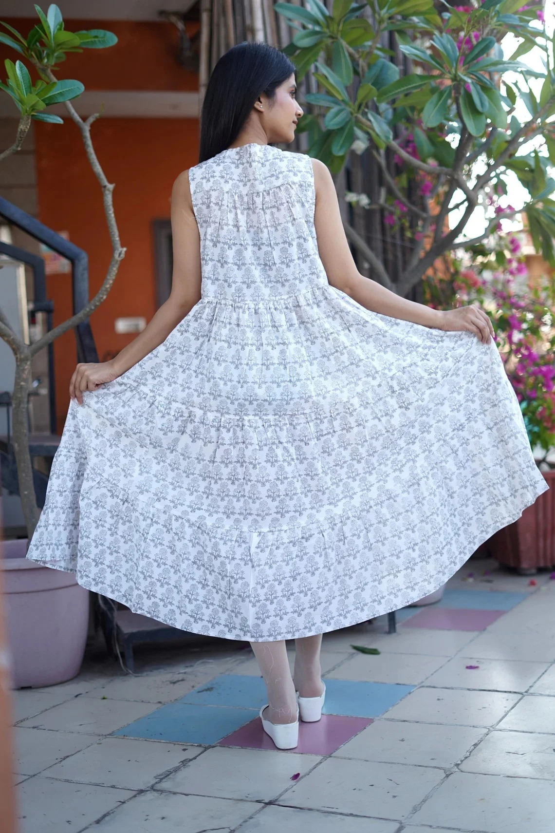 Women Cotton Summer Dress Hand Block Print Cotton Tier Dress Mandarin Collar Sleeveless Floral Print Long Maxi Gown For Women