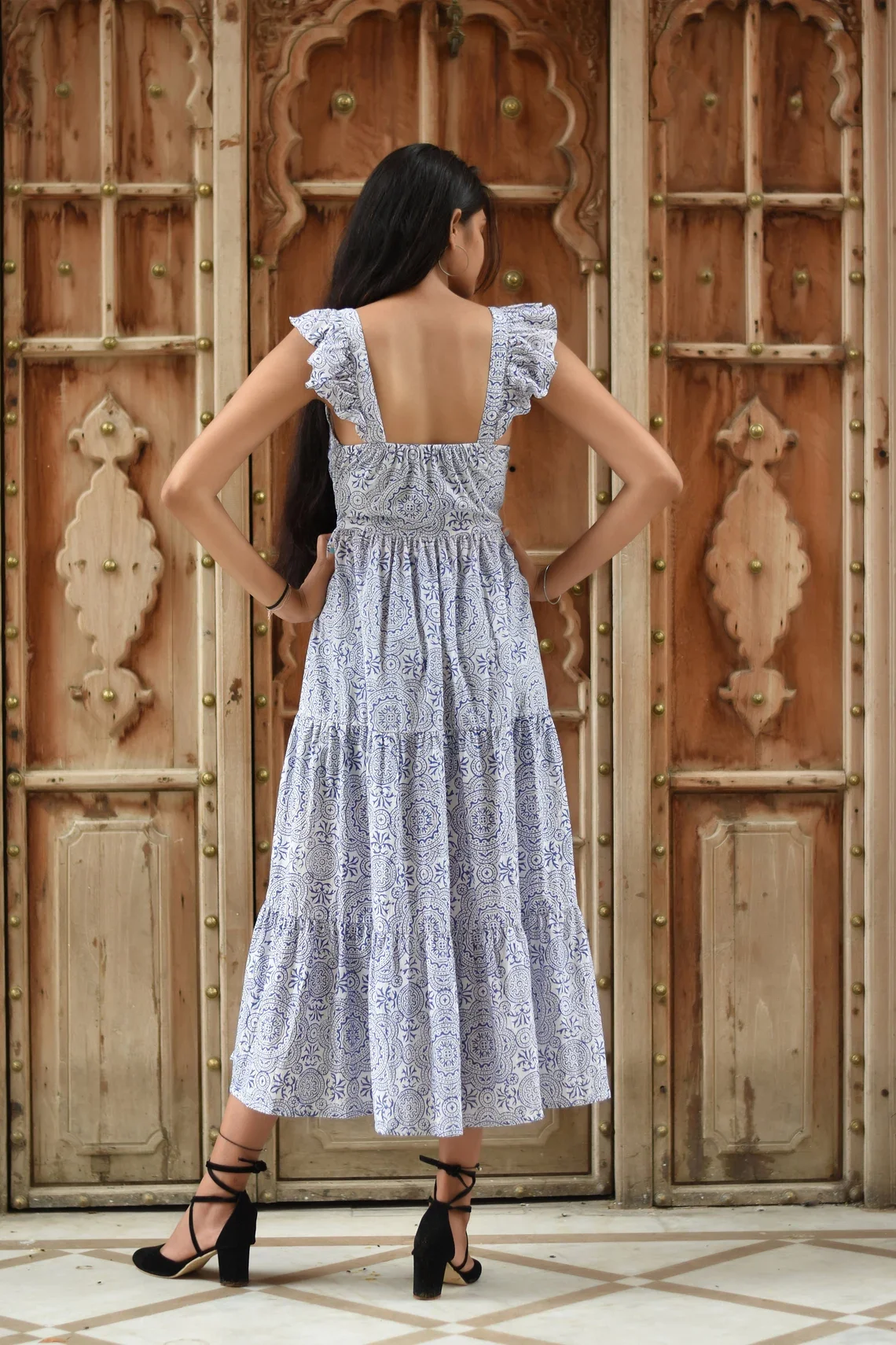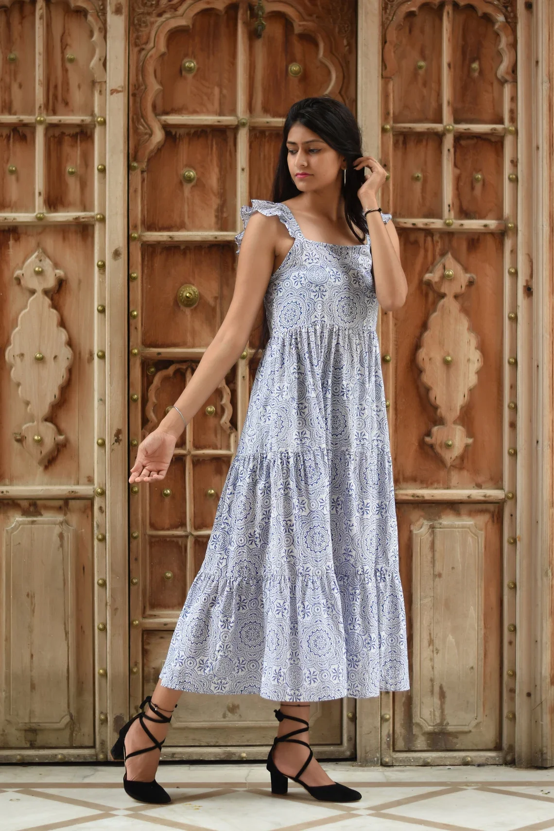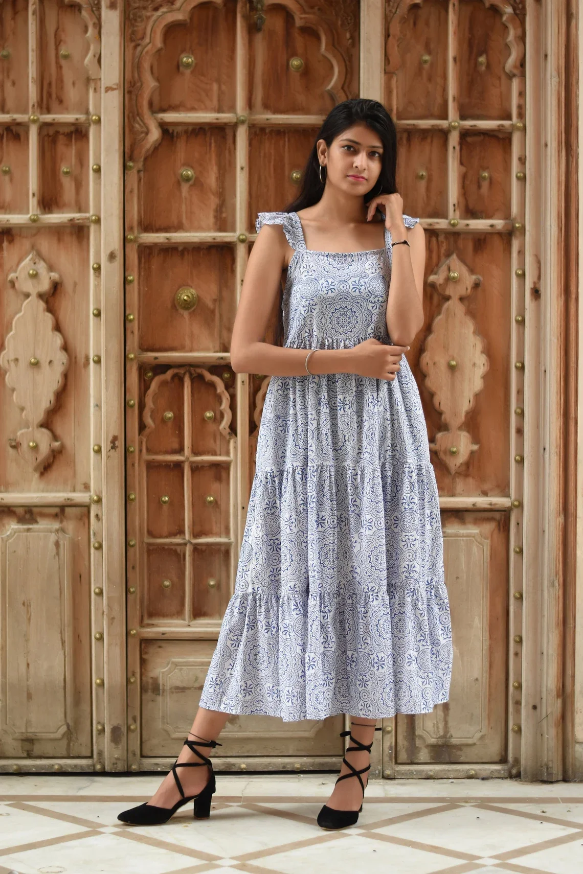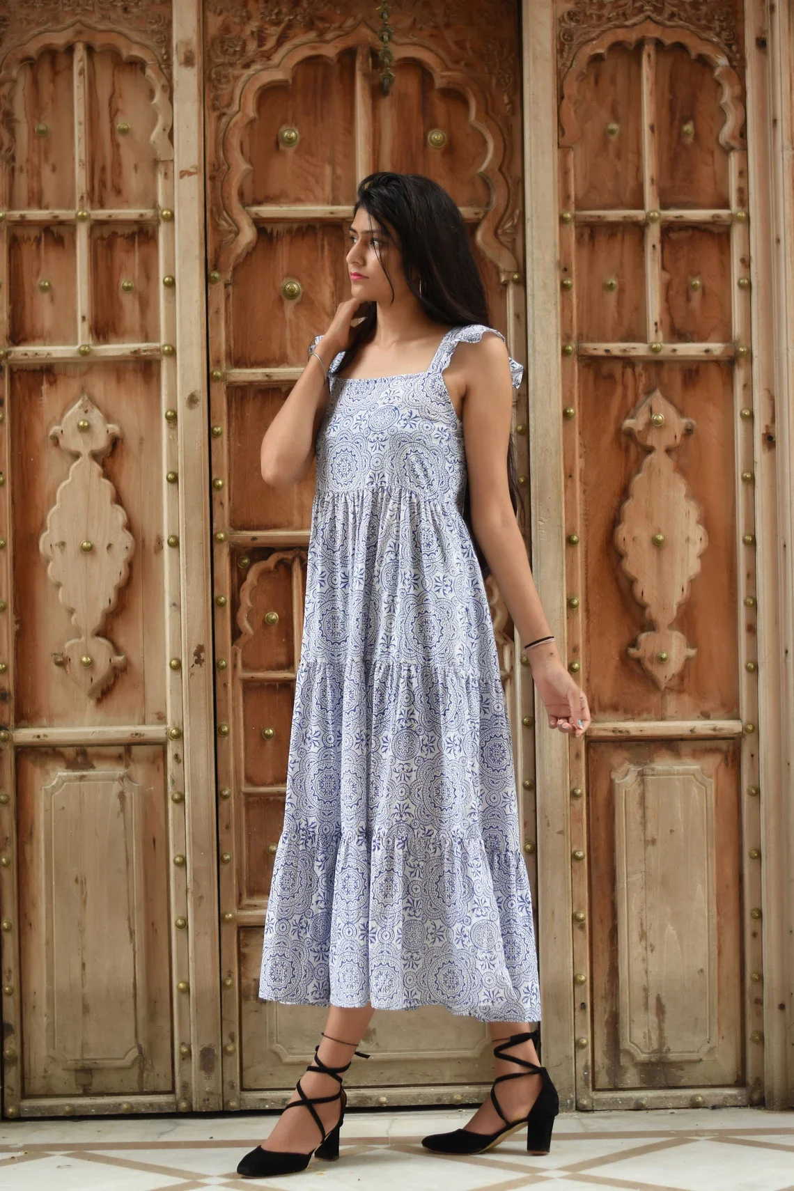 Cotton Block Printed Maxi Dress White Solid Knitted Summer/Winter/Autumn Season Sustainable Style Gift for Her