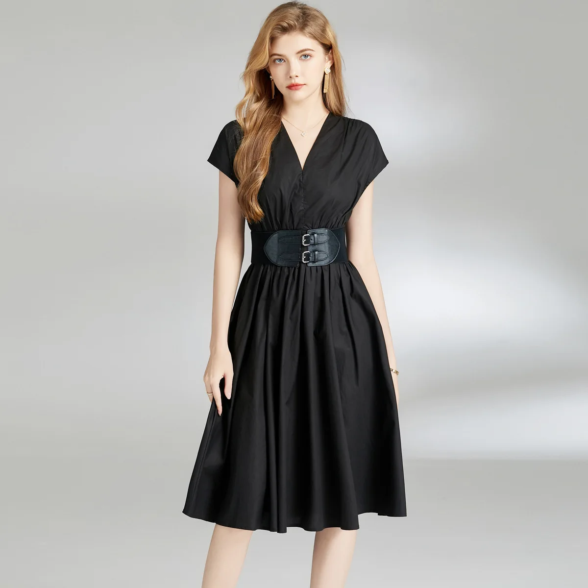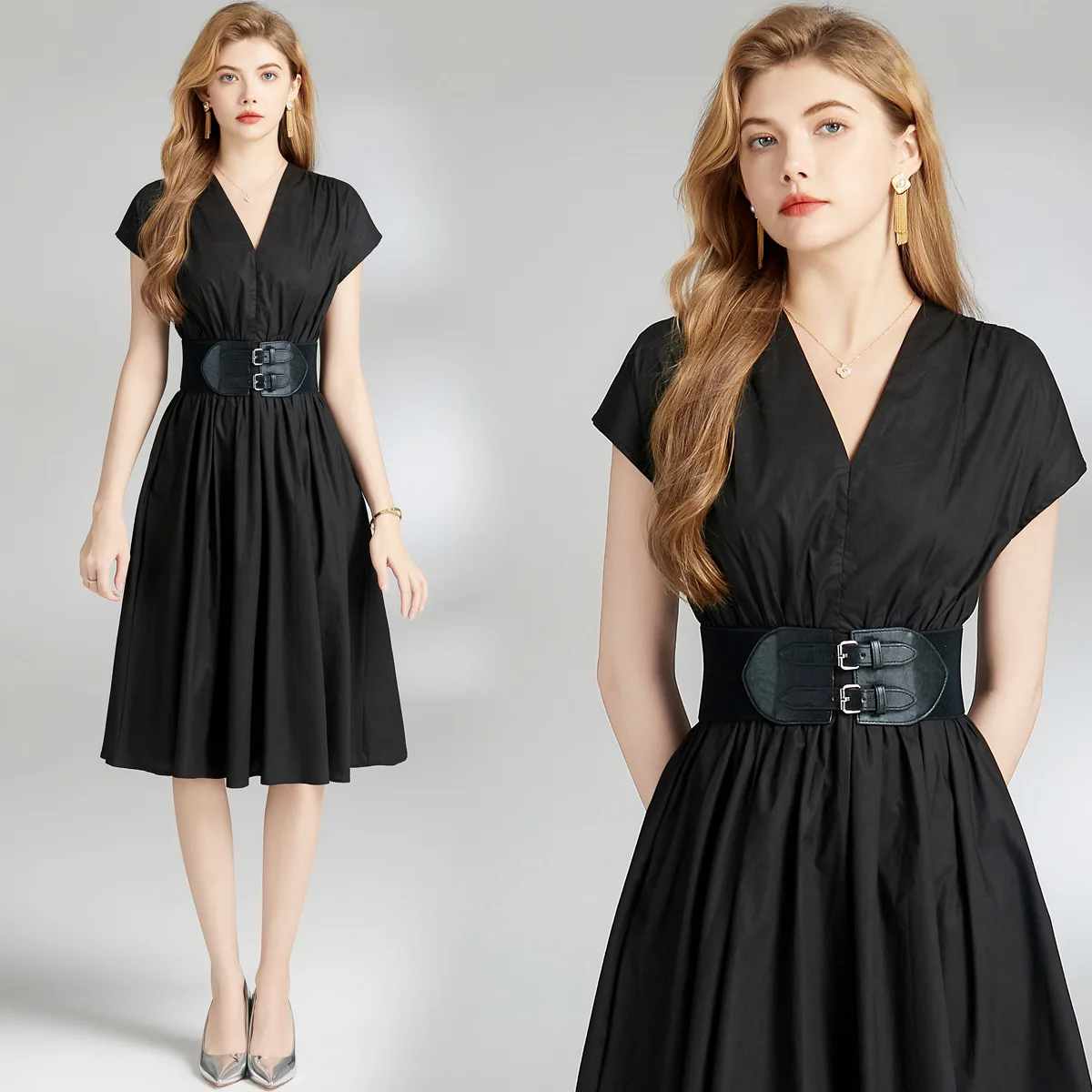 6834 Women's Elegant V-Neck Midi Dress for Summer Casual Career Real Shot Belt Solid Pattern Natural Waistline Woven Washable