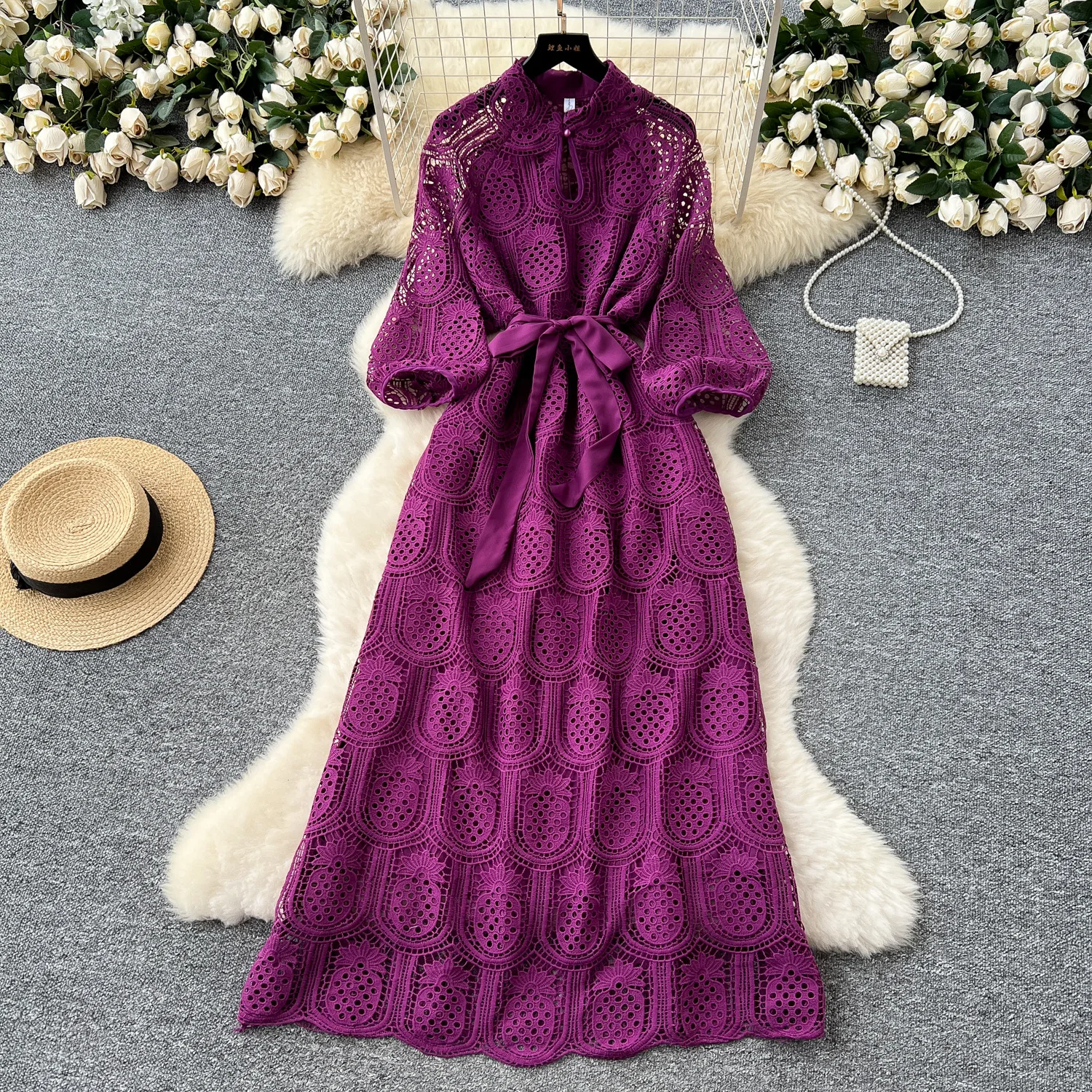 2026 Elegant Vintage Korean Style Midi-Length Dress Casual Hollow Embroidered Lace with Natural Waistline Woven Pattern