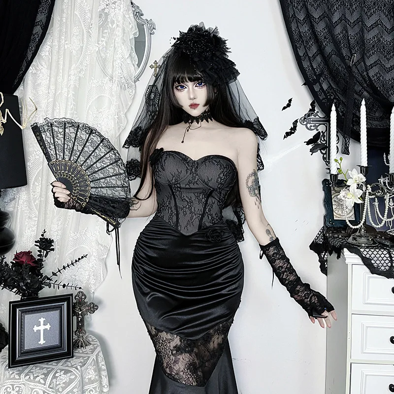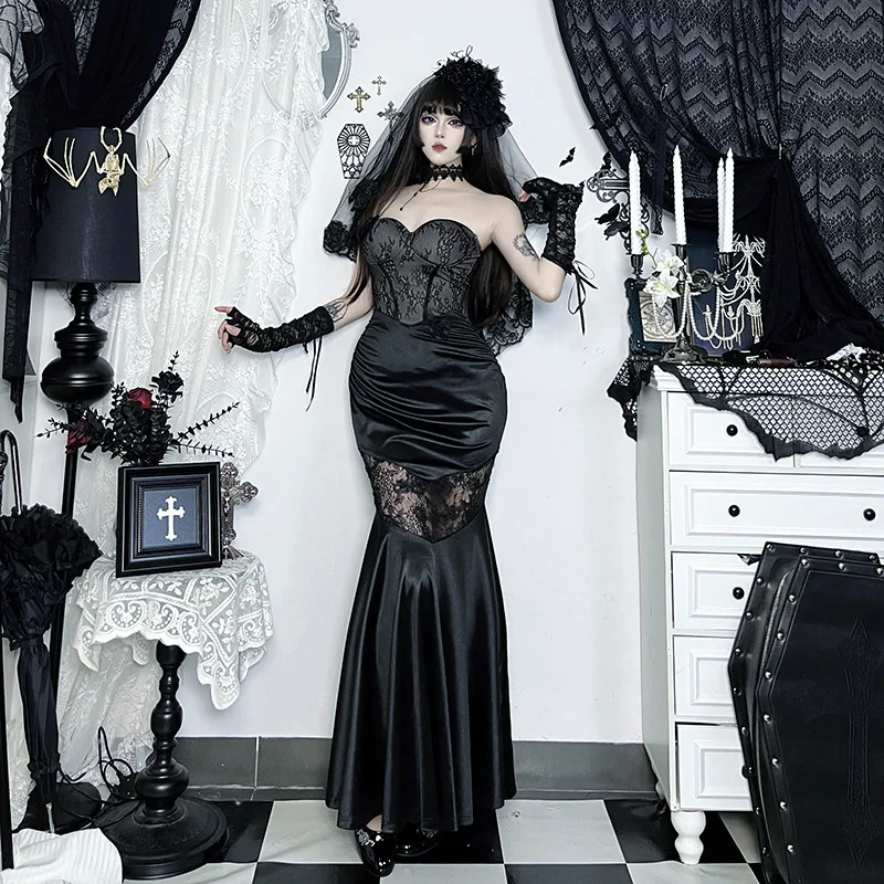 European American Gothic Strapless Waist Cinching Mermaid Maxi Dress Lace Patchwork Bodycon Gown Dark Aesthetic Party Dress