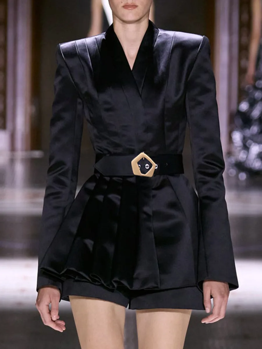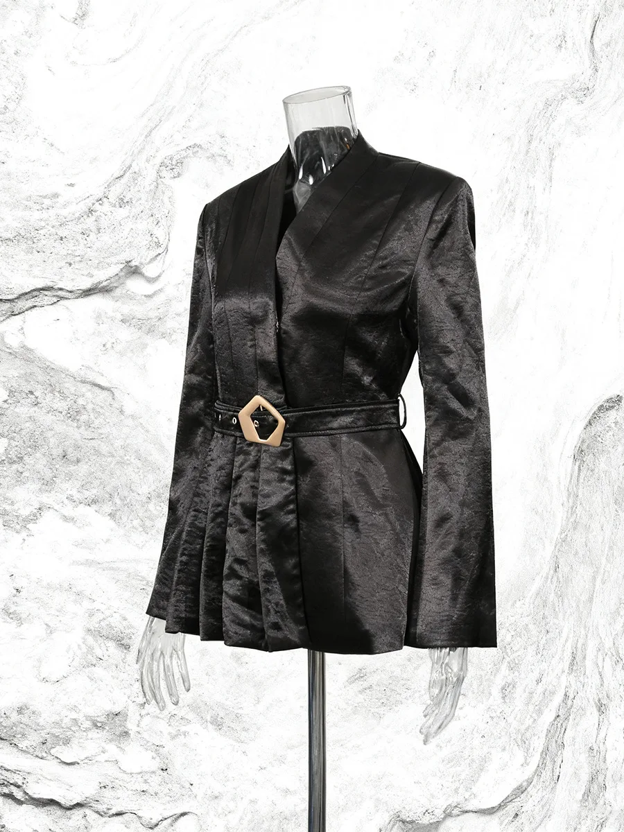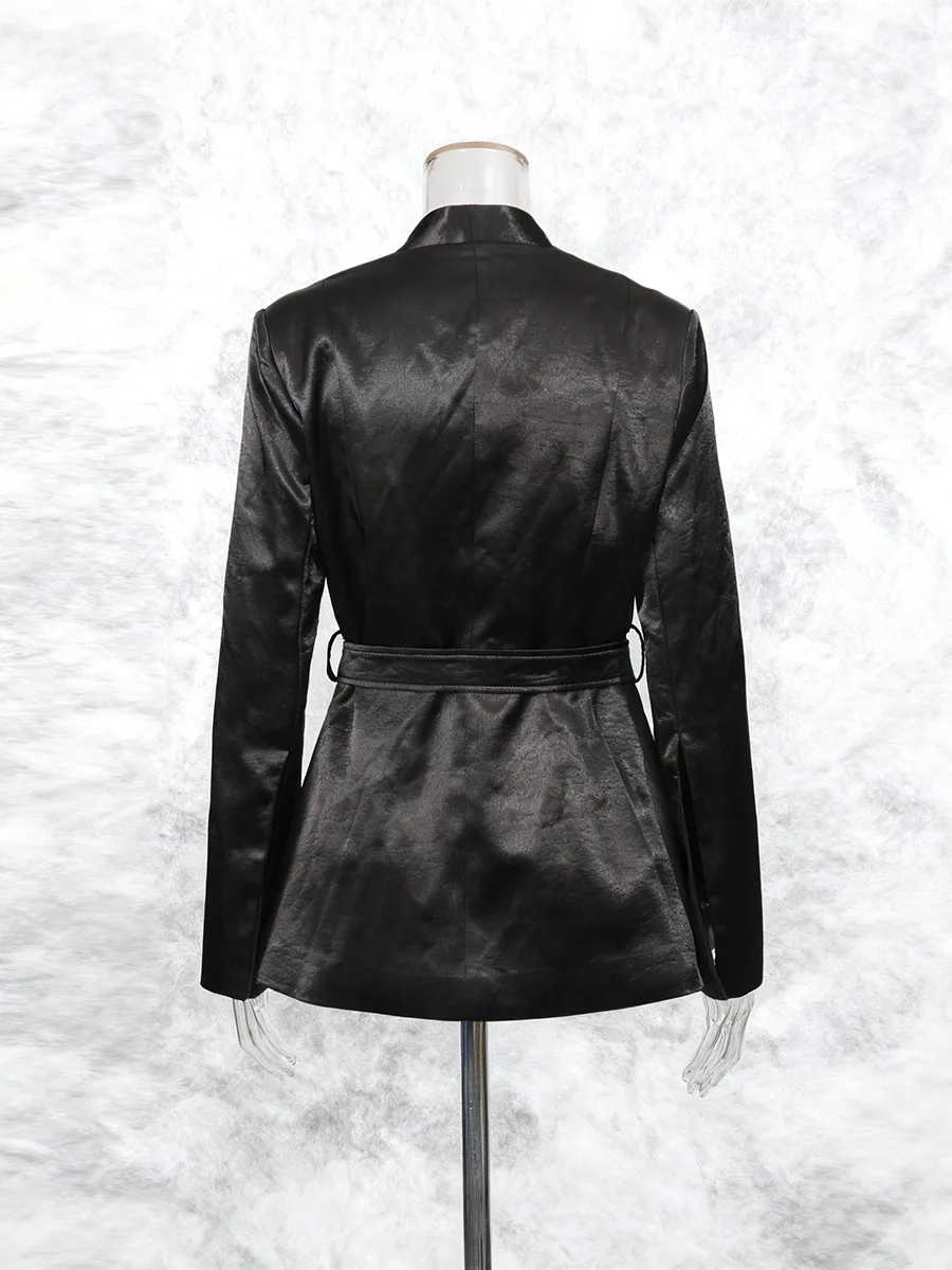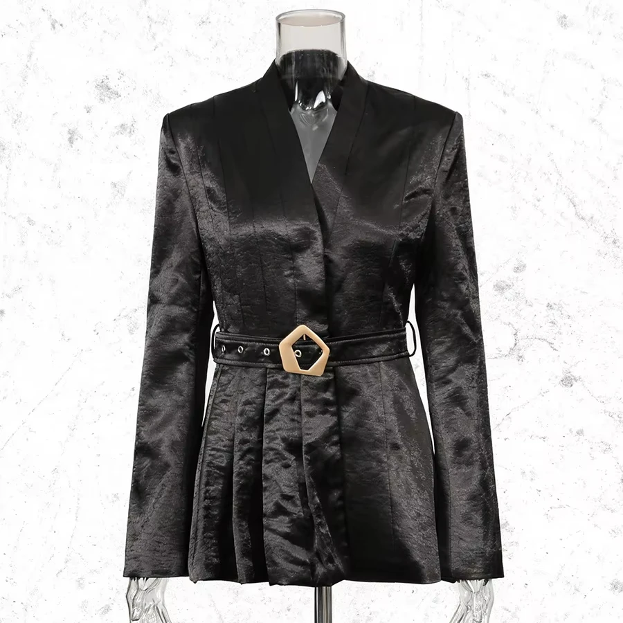Customizable Women's High-End Satin Blazer with Statement Buckle Belt Avant-Garde Structured Shoulder Tailored Suit Jacket